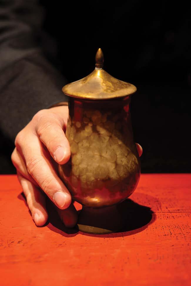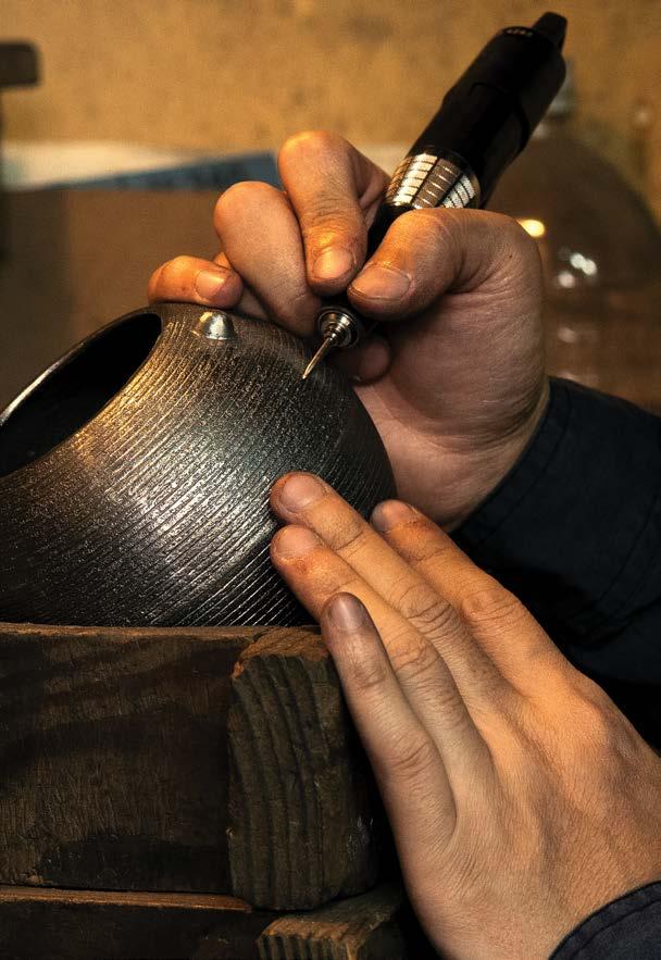 have been removed, the piece will be charcoal fired at 1,652-degrees for an hour and its interior coated with an oxidized layer, rendering it rust-proof even when filled with water. After firing, the exterior is polished and finished with a lacquer coating, which imparts color and prevents further oxidation.