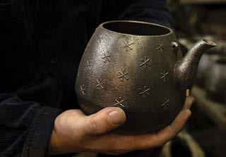 Though his role was shaped in part by filial obligation, there is no doubt that Nambu tekki is Shigeoâs calling. In the workshop, a meditative focus settles over him. There, his hands deftly shape the testubin (kettle) mold, pressing dozens of nodes onto the surface in an arare (hail) pattern, a hallmark of Nambu ironware. More than mere aesthetics, the technique thickens the iron, increasing its capacity to retain heat.