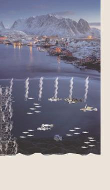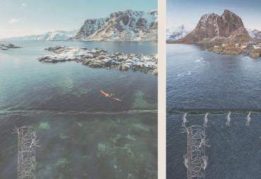The porous columns serve as artificial reefs, mimicking the natural habitats found in marine ecosystems. These structures provide ample surface area for seaweed to anchor and grow, creating a lush underwater landscape that is both visually stunning and ecologically beneficial. The rough texture and varied openings of the columns encourage the settlement of plankton and small fish, fostering a thriving marine community. Furthermore, the use of locally sourced Lofoten stones in conjunction with the columns ensures that the materials are in harmony with the surrounding environment. These stones, naturally weathered and uniquely textured, add to the structural integrity and visual coherence of the pier. The integration of these elements supports the local economy and reduces the environmental footprint of the construction process.