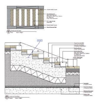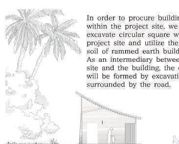 I will use rammed earth as a method, which is popular and traditional way to make the wall in Asia and Africa. The platework is made from a combination of earth, sand, clay, and 5% cement. I collected sand, gravel, soil and woodchips from the site to sample the materials for the platework. There is no significant differences in surface temperature, but slight differences in strength. This indicated the need to change the proportion of concrete distribution according to the material. 4. Design detail