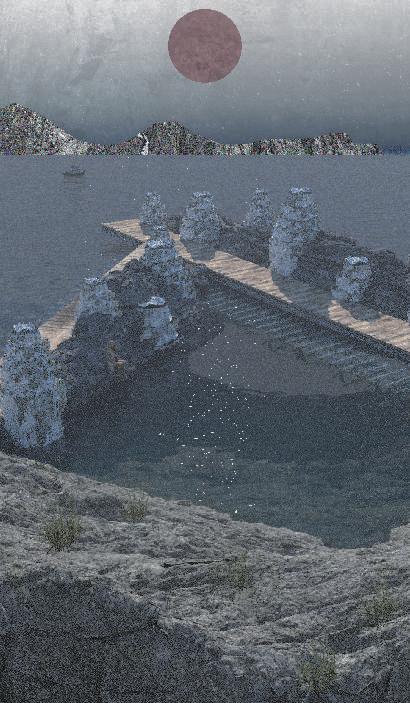 Seaweed pier is an aquatic space where people can observe and enjoy the process of growing seaweed, not only by developing a seaweed field connected to the pier as a walkway but also by creating a habitat for seaweed, plankton, and small fish through the formation of a porous structure on the columns supporting the deck itself. This design integrates both functionality and ecological enhancement, transforming the pier into a dynamic and educational environment