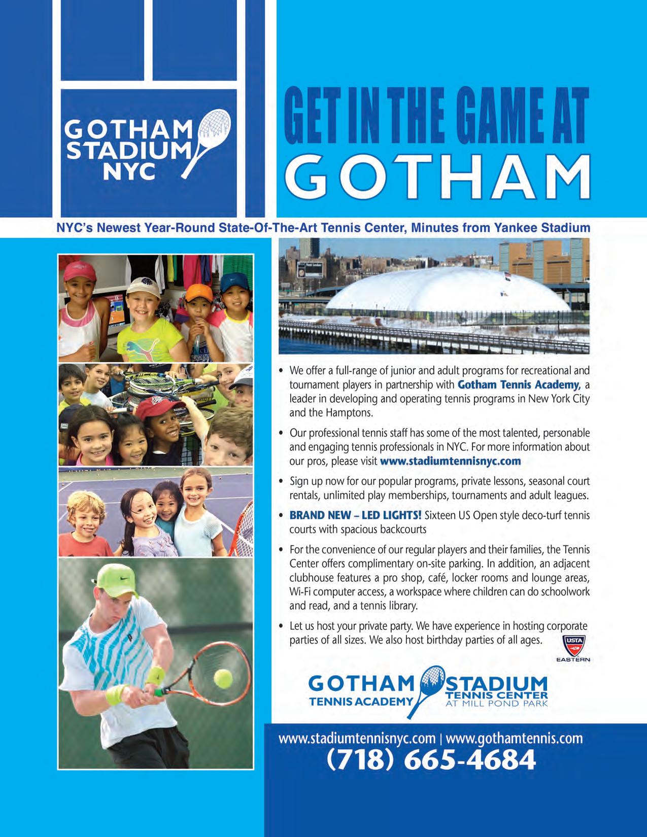 •We offer a full-range of junior and adult programs for recreational and tournament players in partnership with Gotham Tennis Academy, a leader in developing and operating tennis programs in New York City and the Hamptons.