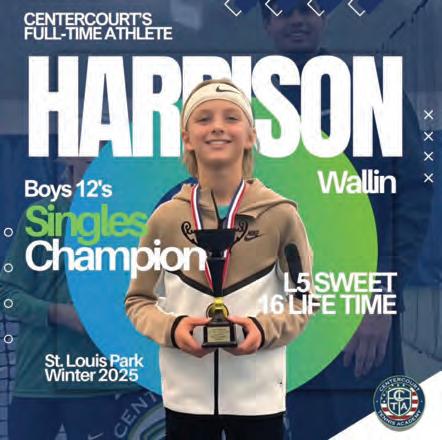 Harrison Wallin of Centercourt Tennis Academy was the Boys 12s singles champion at the L5 Sweet 16 event in St. Louis Park, Minnesota. Wallin won each of his matches in straight sets, dropping a total of just eight games in the entirety of the tournament.