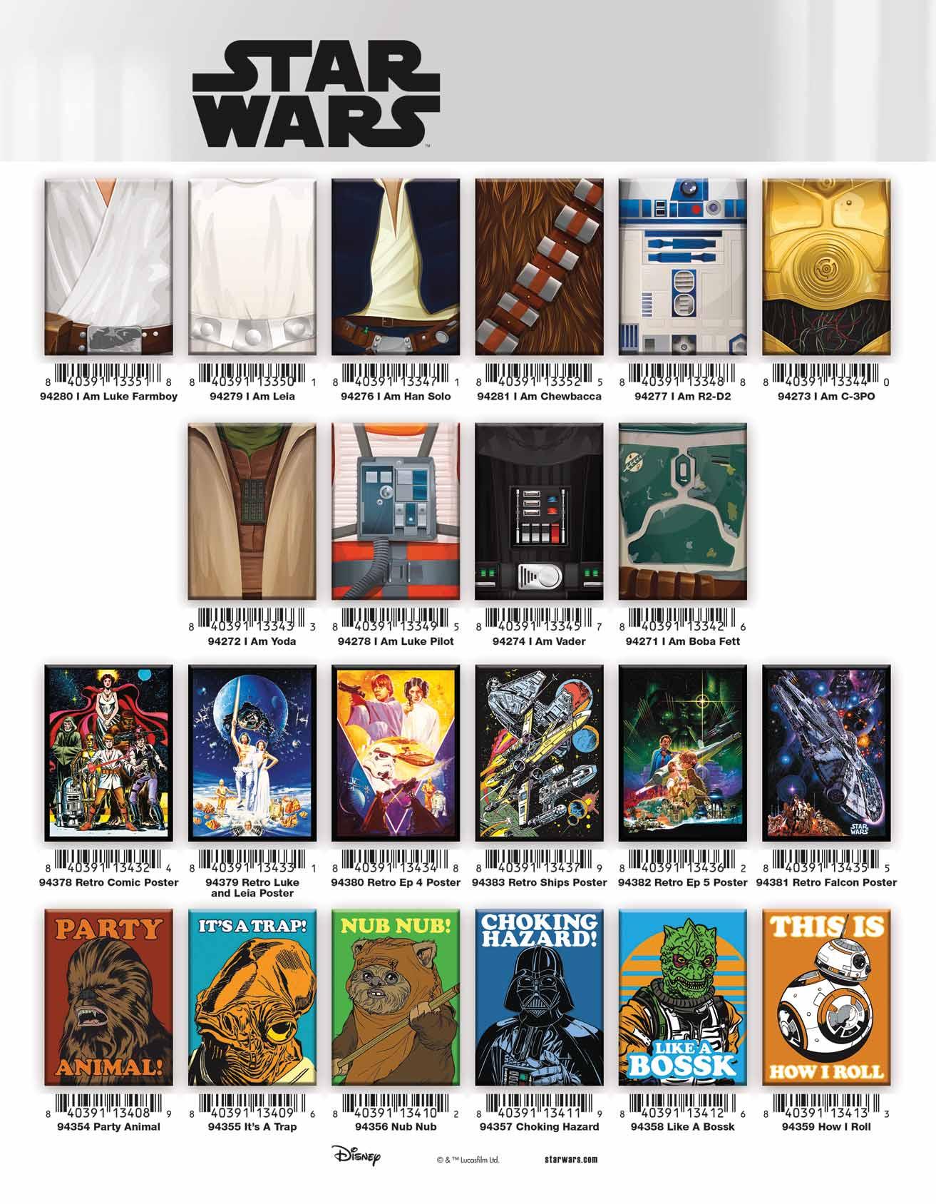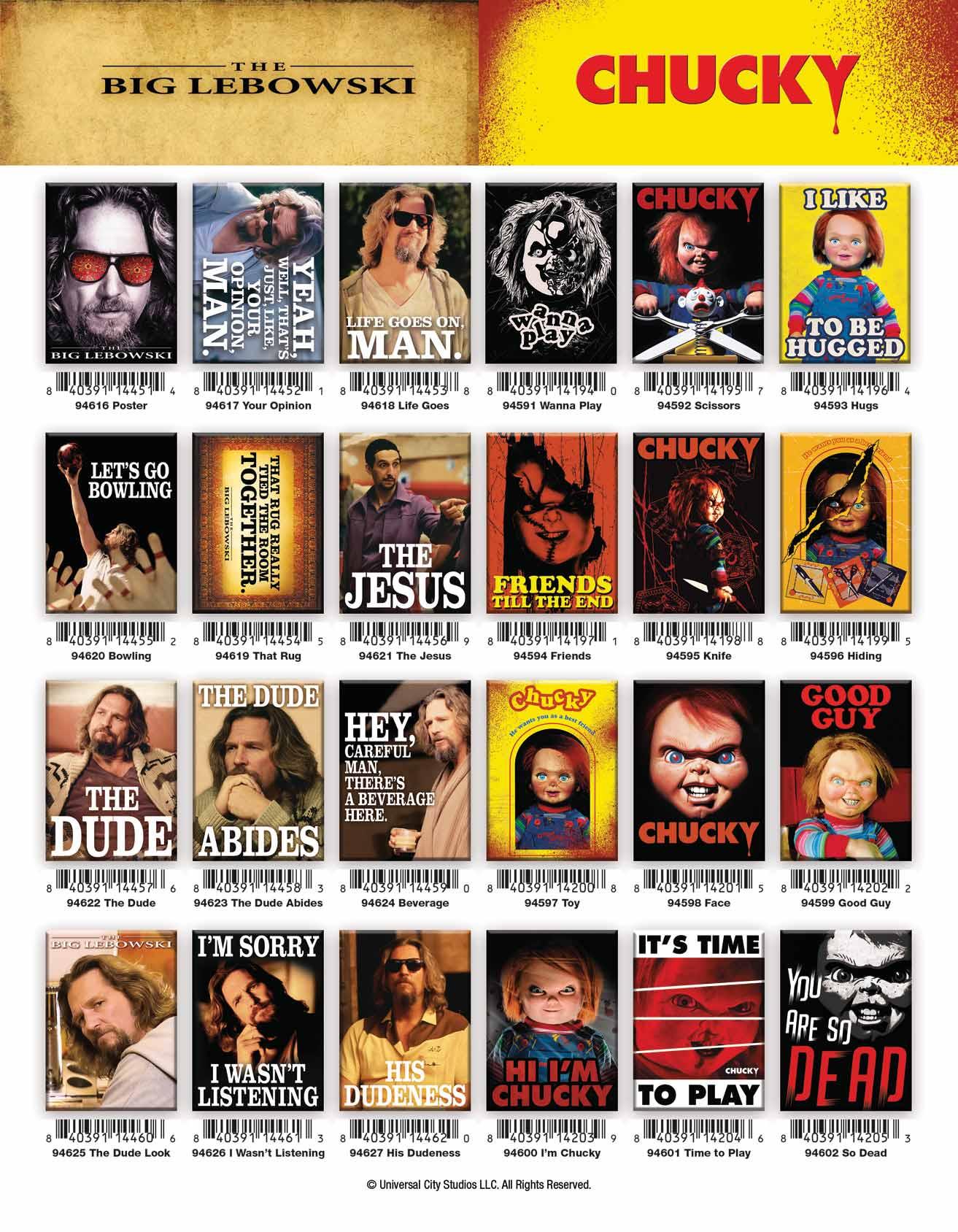 23, 30, 55, 59, 68, 121, 129, Emily the Strange 86, Fender 55, 69, Fraggle Rock 134, Friday the 13th 62, Friends 43, 58, 60, Frosty the Snowman 172, Gamago 6-35, 144-146, 156, 164-167, Garfield 34, 67, 80, Godzilla VS. Kong 53, 79, 129, Grateful Dead 44, 55, 59, 69, 124, 132, Gremlins 62, 158, Halloween II 33, 62, 99, 157, 158, 160, Hammer Horror 54, 62, 100, 137, 157, 158, 161, 162, Harry Potter 150, Hershey’s 150, 151, 153, Hey Arnold! 67, How the Grinch Stole Christmas 172, 174, 176, ICUP 37-50, 147, 148, 168, 169, Imagined Worlds 103, 136, 137, IT 61, 158, JAWS 33, 53, 61, 77, Jay & Silent Bob 54, 62, 63, 101, 135, 136, Johnny Cash 55, 122, 131, 132, Jurassic Park 53, 61, 75, Jurassic World 33, 74, KISS 55, 69, 127, 131, Labyrinth 54, 62, 105, 134, Lord of the Rings 61, Marvel 65, 66, 150,NASA 22, 56, 69, 109, 137, 153, National Lampoon 169, 170, 171, 172, Oh, the Places You’ll Go! 68, 90, 135, Paul Frank 9, 68, 144, Peanuts 8, 9, 30, 34, 37, 38, 54, 59, 67, 83, 84, 85, 153, 154, 159, 164, 165, Pink Floyd 23, 46, 55, 59, 69, 126, 129, 130, Random Galaxy 70, 102, Rudolph the Red Nosed Reindeer 165, 172, 173, 176, 177, Rugrats 66, Smithsonian 56, 69, 137, Space Invaders 106, 149, SpongeBob SquarePants 34, 66, 82, Star Trek 21, 59, 60, 97, 133, 134, 159, Star Wars 33, 39, 58, 63, 64, 65, 91-94, 155, Sugar Skulls 70, The Big Lebowski 34, 61, 98, The Cat in the Hat 68, 89, 135, The Exorcist 62, 158, The Flintstones 150, The Legend of Korra 67, The Mandalorian 33, 40, 41, 65, 94, 95, 155, 170, 171, The Office 34, 53, 60, 87, The Polar Express 172, The Texas Chainsaw Massacre 62, 158, The Wizard of Oz 63, TMNT 66, Where The Wild Things Are 68, 88, Where’s Waldo 54, 68, 134, Willy Wonka 150, Woodstock 55, 69, 123, 132