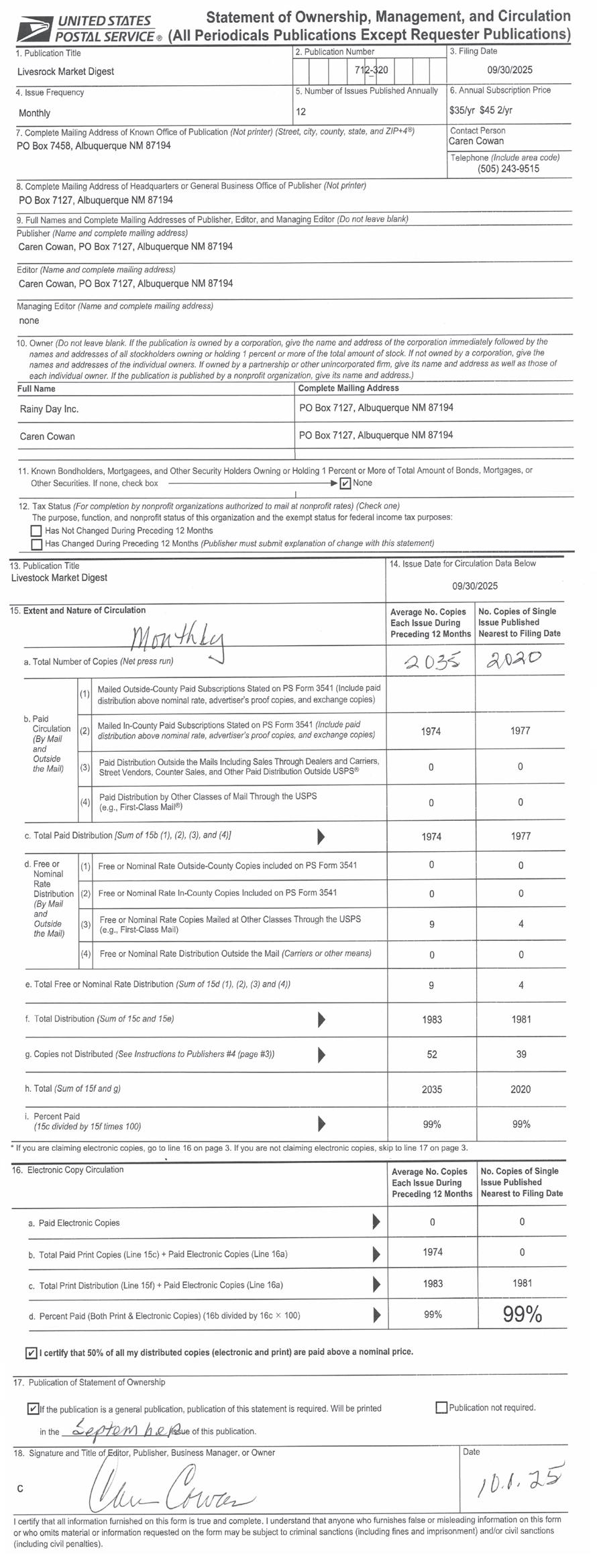 Livestock Market Digest (1SSN 0024-5208) (USPS NO. 712320) is published monthly except semi-monthly in September in Albuquerque, N.M. 87104 by Livestock Market Digest, Inc. Periodicals Postage Paid at Albuquerque, N.M. POSTMASTER-Send change of address to: Livestock Market Digest, P.O. Box 7458, Albuquerque, N.M. 87194