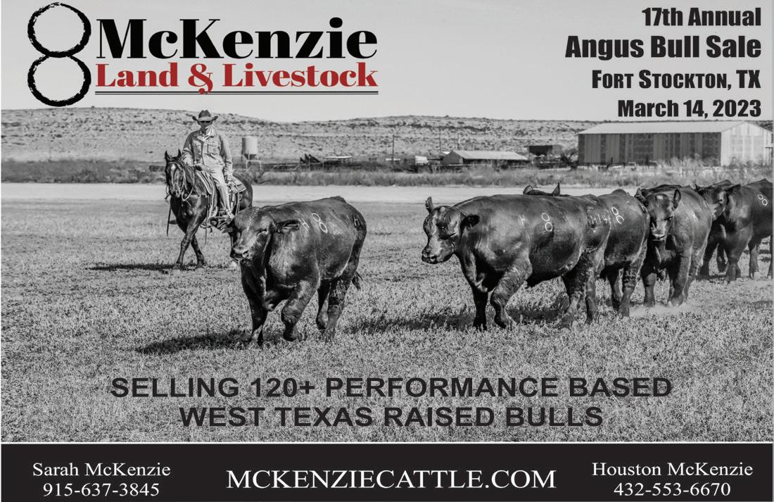 65 years of ranch raised, performance selected bulls. Mary Lou Bradley-Henderson, (940) 585-6471 James Henderson, (940) 585-6171 www.bradley3ranch.com ANNUAL BULL SALE Saturday, February 11, 2023 12 Noon at the ranch east of Estelline, Texas 200+ Angus Bulls 90+ Charolais Bulls 60 Angus Females • Complete Performance Data • 15-18 month old Registered Bulls • All Bulls have BSE, DNA tested, PAP EPDs for Angus Bulls Call for your catalog!