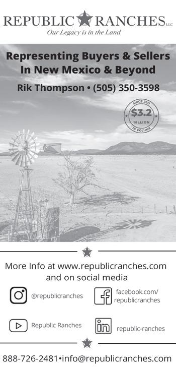 108 JANUARY 2023 JANUARY 2023 108 A part of Purina’s Sustained® Nutrition program, Wind and Rain® Storm® Cattle Mineral is built on research-proven intake consistency and unsurpassed weather resistance, making it the best option to support health and enhance reproduction and growth performance in your cattle. ©2015 Purina Animal Nutrition LLC. All rights reserved. Contact your Purina Animal Nutrition dealer or visit purinamills.com/cattle to learn more. ® Bunks Feed Hobbs, NM Jim Selman • 575-397-1228 Case & Co. Tucumcari, NM Luke Haller • 575-403-8566 Cowboy’s Corner Lovington, NM Wayne Banks • 575-396-5663 Creighton’s at The Fort Fort Sumner, NM Garland Creighton • 575-760-6149 Creighton’s Town & Country Portales, NM Garland Creighton • 575-356-3665 Double D Animal Nutrition Artesia, NM Don Spearman • 575-302-9280 Guadalupe Mountain Farm, Ranch & Show Supplies Carlsbad, NM Amber Hughes • 575-988-3508 One Stop Feed, Inc. Clovis, NM Austin Hale • 575-762-3997 Purina Animal Nutrition Eastern NM Steve Swift • 575-760-3112 Purina Animal Nutrition Western NM Joram Robbs • 520-576-8011 Roswell Livestock & Farm Supply Roswell, NM 575-622-9164 Williams Ranch Supply Quemado, NM Jimbo & Trisha Williams 505-238-4656