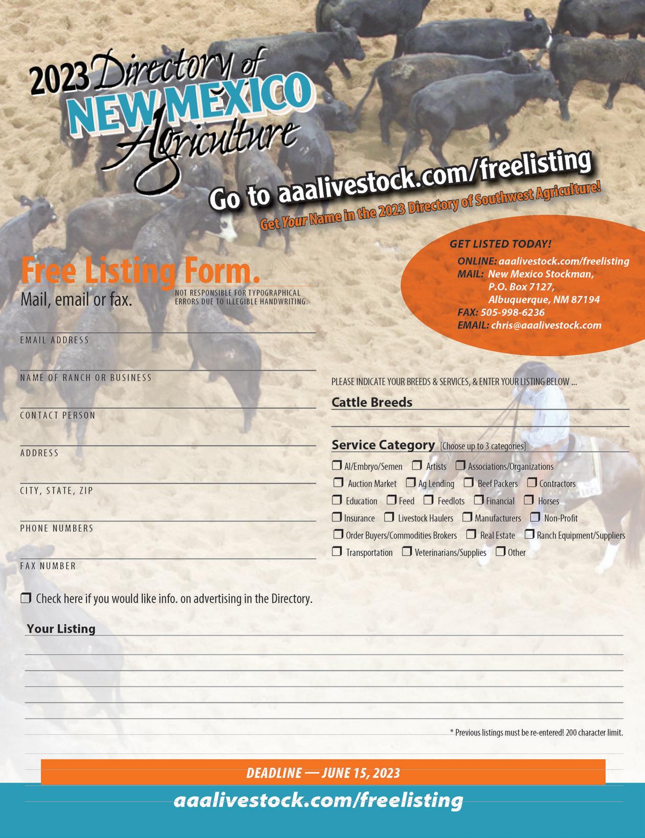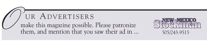 POSTMASTER: Send address changes to New Mexico Stockman, P.O. Box 7127, Albuquerque, NM 87194. Periodicals Postage paid at Albuquerque, New Mexico, and additional mailing offices. Copyright© 2015 by New Mexico Stockman. Material may not be used without permission of the publisher. Deadline for editorial and advertising copy, changes and cancellations is the 10th of the month preceding publication. Advertising rates on request.