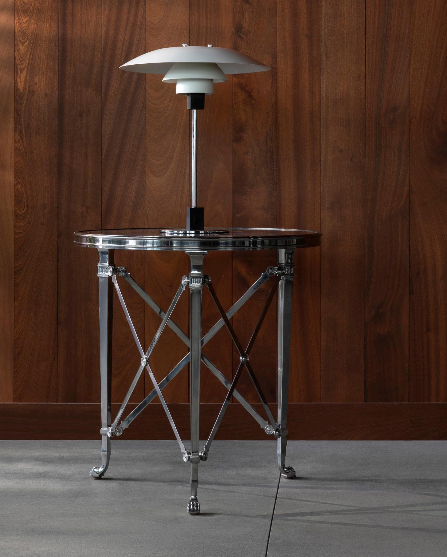 chrome-plated brass and steel, spun aluminum and bakelite h. 21-1/2”, dia. 17-3/4”