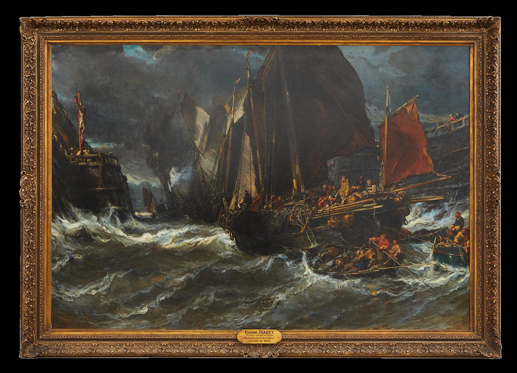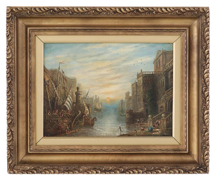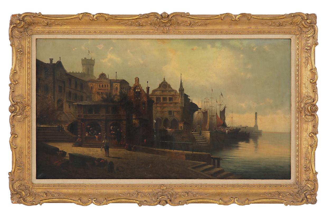 “Harbor Scene” oil on canvas illegibly signed lower left. Framed. 21” x 37”, framed 27-1/2” x 44” $1,000-$1,500