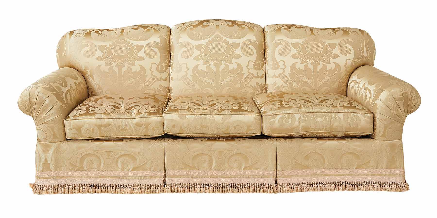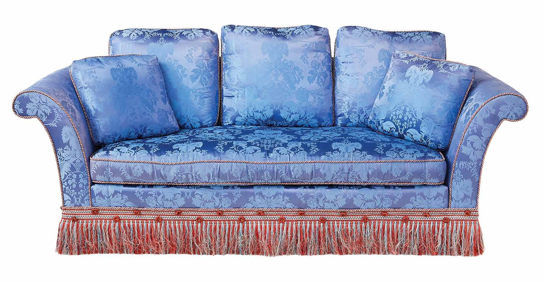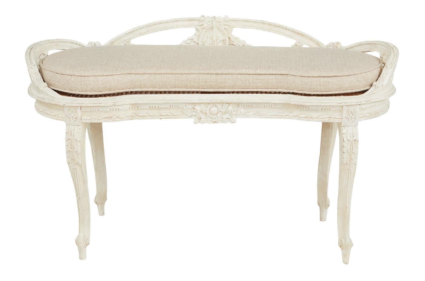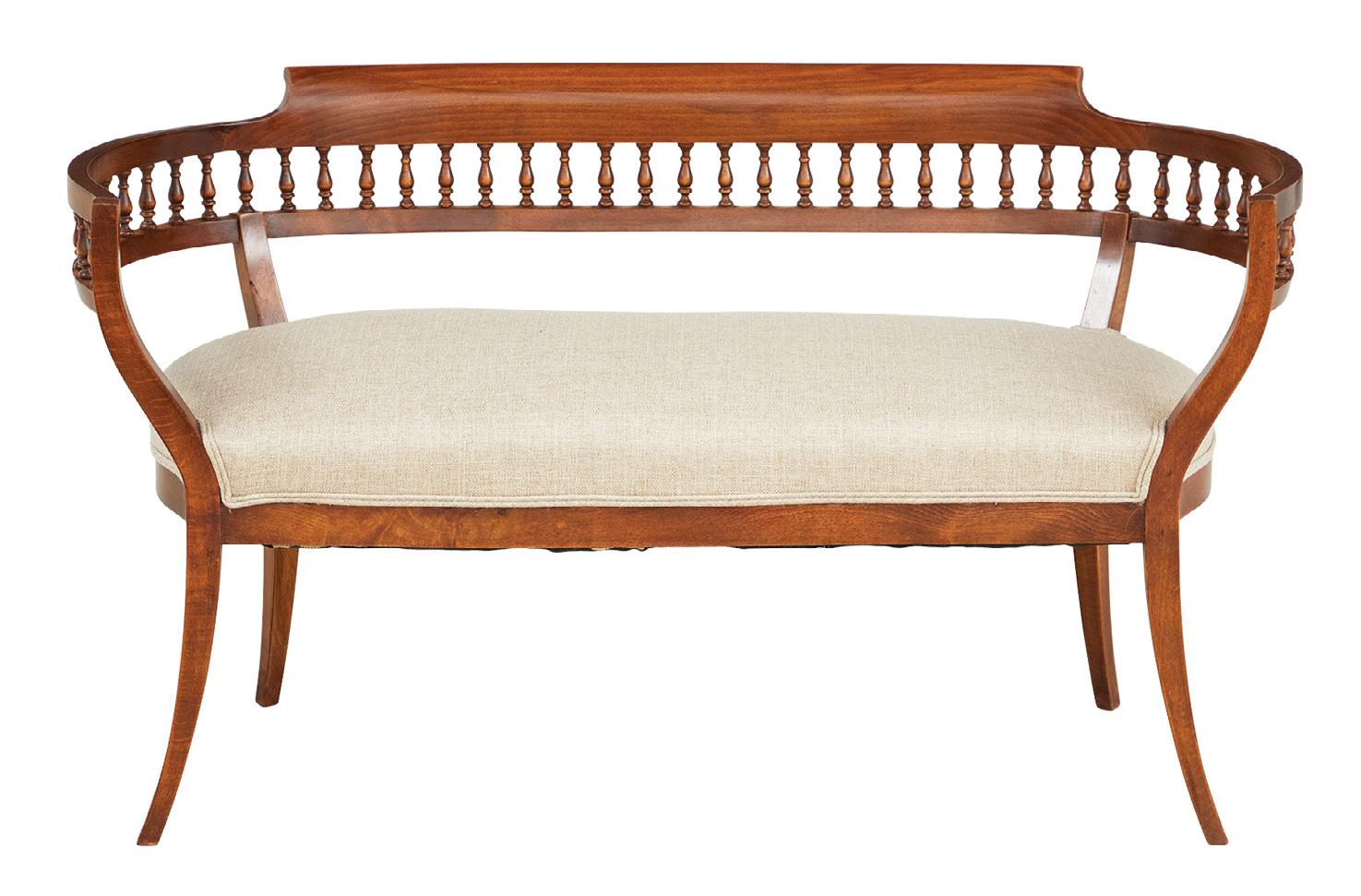 20th century, the padded back within a molded frame with finial accents, joined by downswept arms to the cushioned seat, raised on stop-fluted, tapering circular legs headed by floral-block capitals and ending in toupie feet, upholstered in Fortuny-style fabric. h. 32”, w. 51”, d. 24”