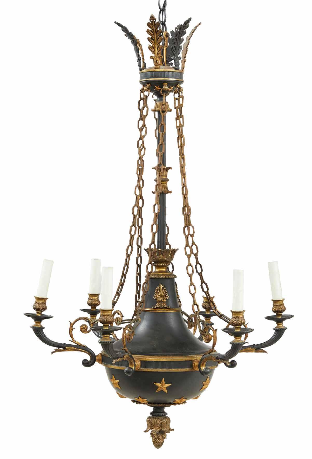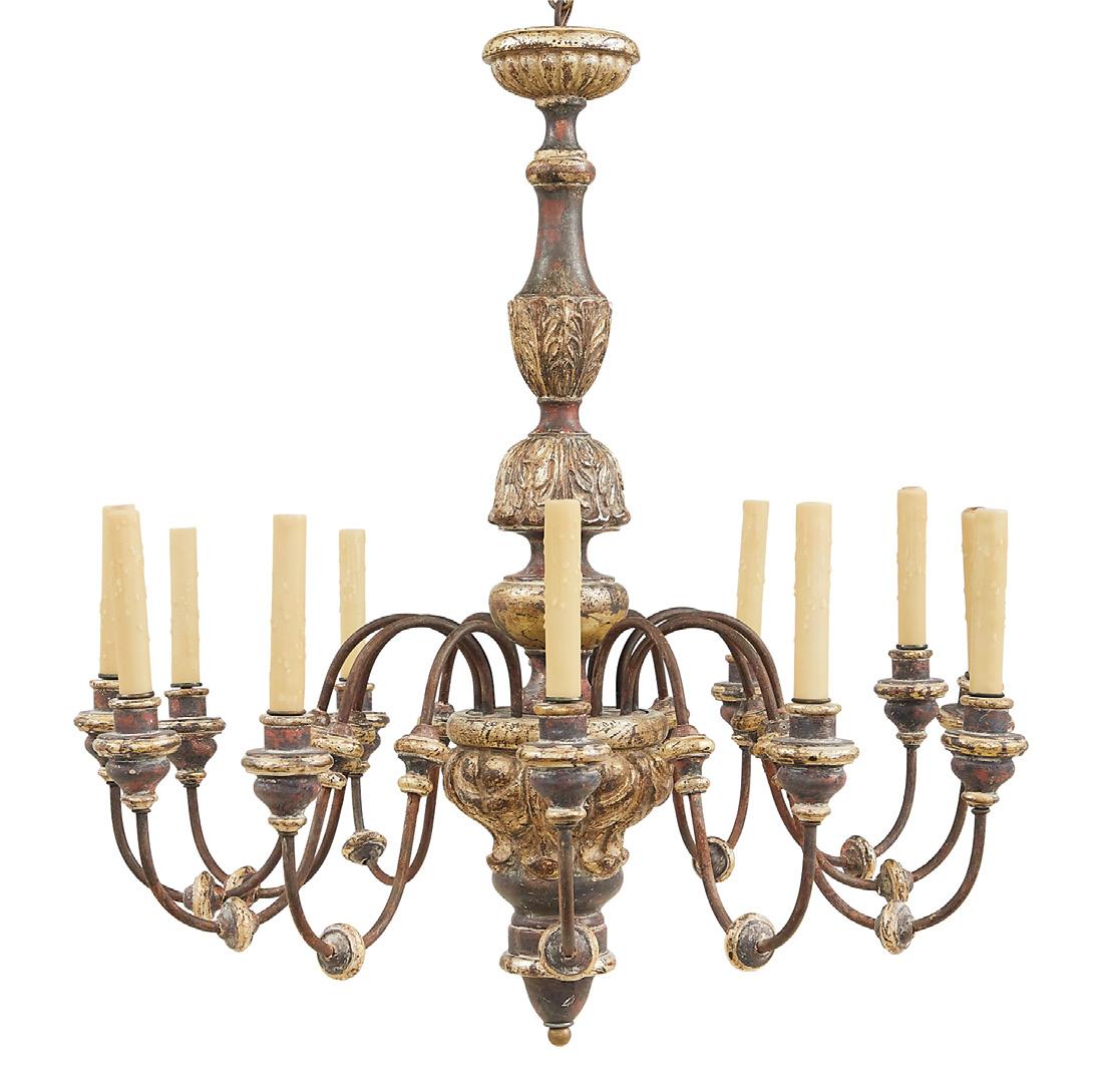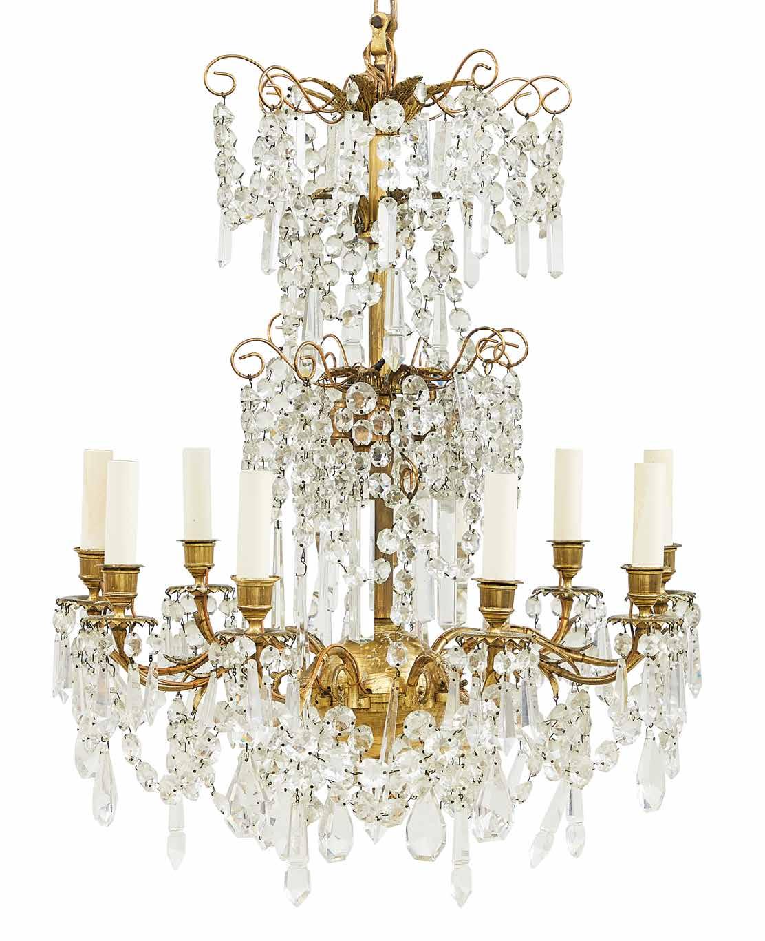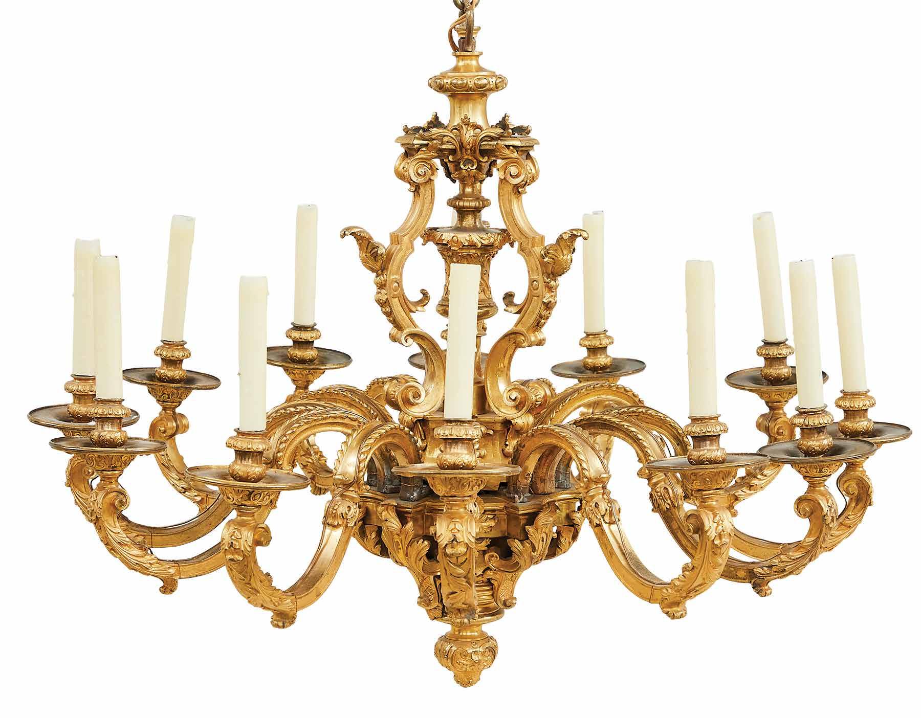 fourth quarter 19th century, of baroque inspiration, the twelve-light chandelier with a tripartite standard decorated with scrollwork and cartouches, pierced scrolls framing a vasiform segment, the scrolled arms with gadrooned trim, molded scrollwork and acanthus leaves, supporting scrolled and leaf-molded candle cups and drip pans.