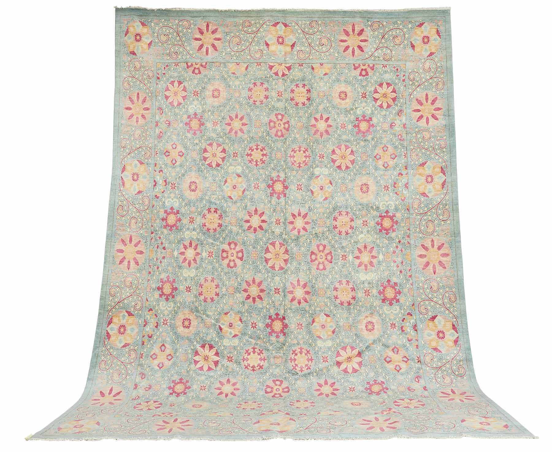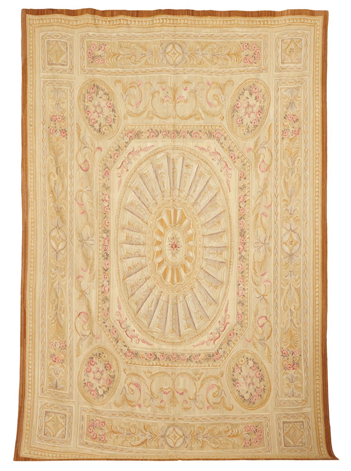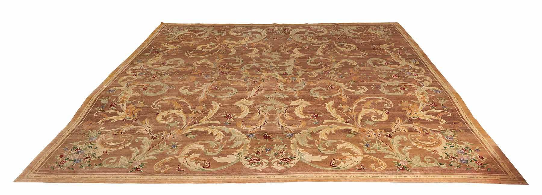 18th century, including a courting couple at right, a woman by a fountain at left, chateau in the distance, allover floral vine border. 116” x 119”