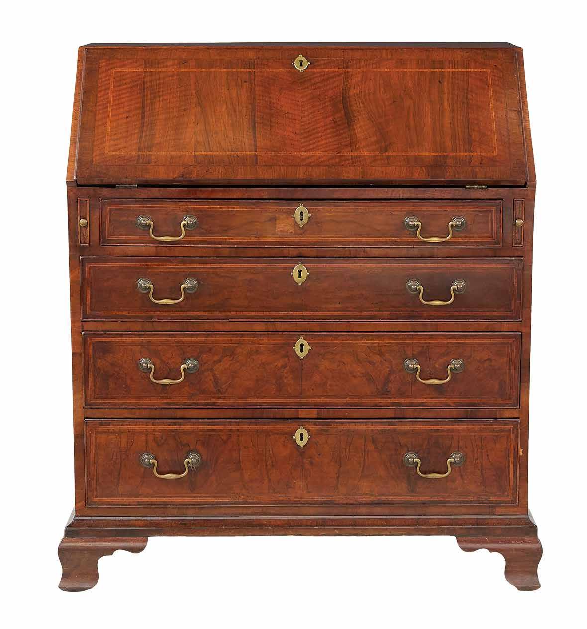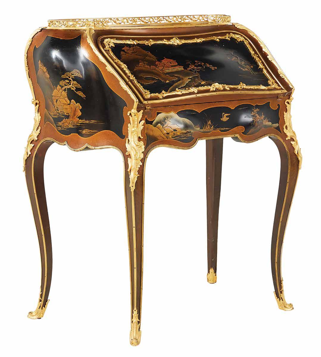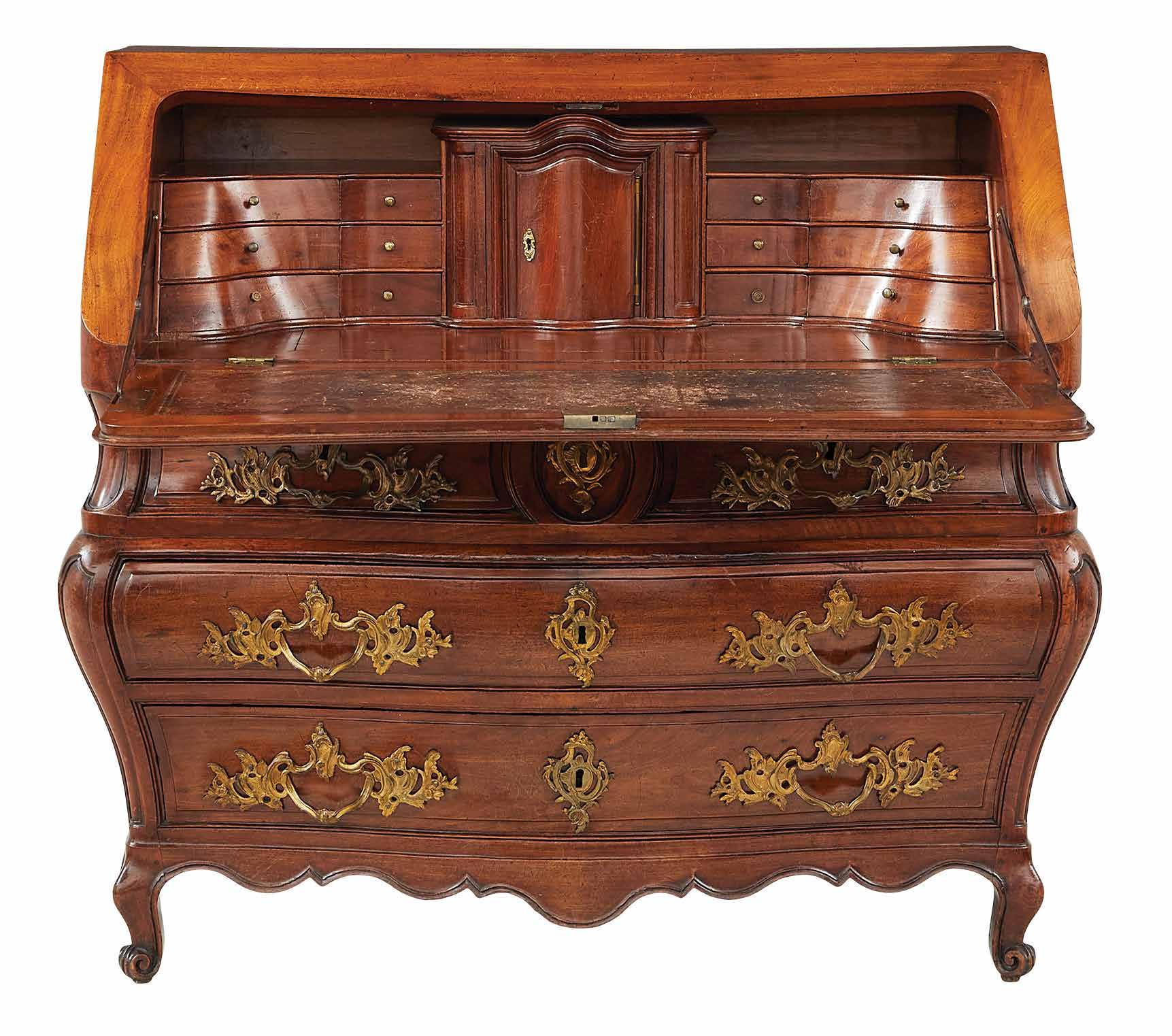 18th century and later, in the Regence taste, the rectangular top above a slant front opening to a leather-inset writing surface and a central cupboard surrounded by a variety of drawers and cubbyholes, above a bombe case fitted with two short drawers over two long drawers, raised on scrolled feet. h. 44”, w. 48-1/2”, d. 25”
