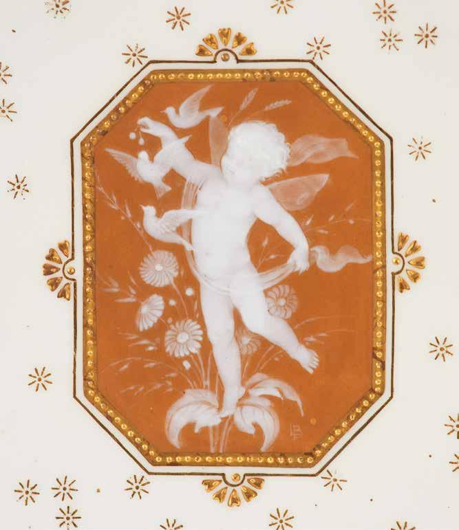 ca. 1894, English, signed by Lawrence Birks, decorated with pate-sur-pate central panels on a cream ground, with frolicking cherubs and swirling diaphanous drapes with birds, branches and flowers, the panel with the birds signed “LB” on the lower right, the border pierced with Greek keys and raised gilt swags of bellflowers, with Minton’s gilt globe mark, the retailer, “Gilman Collamore & Co., New York”, an impressed “Mintons” mark, a diamond registration mark, the 1894 date letter and a painted overglaze decorator’s mark, “K 68514”. dia. 9-1/2”