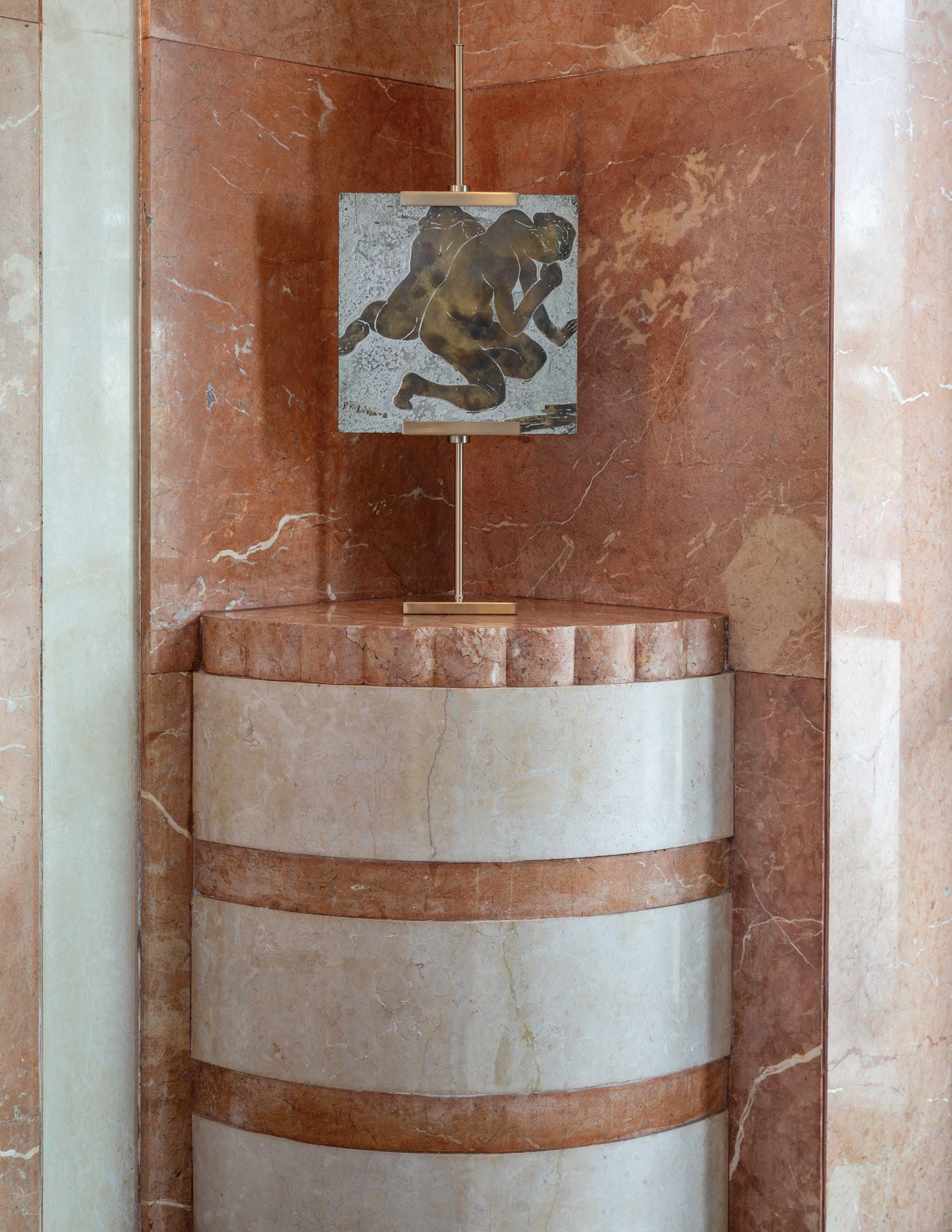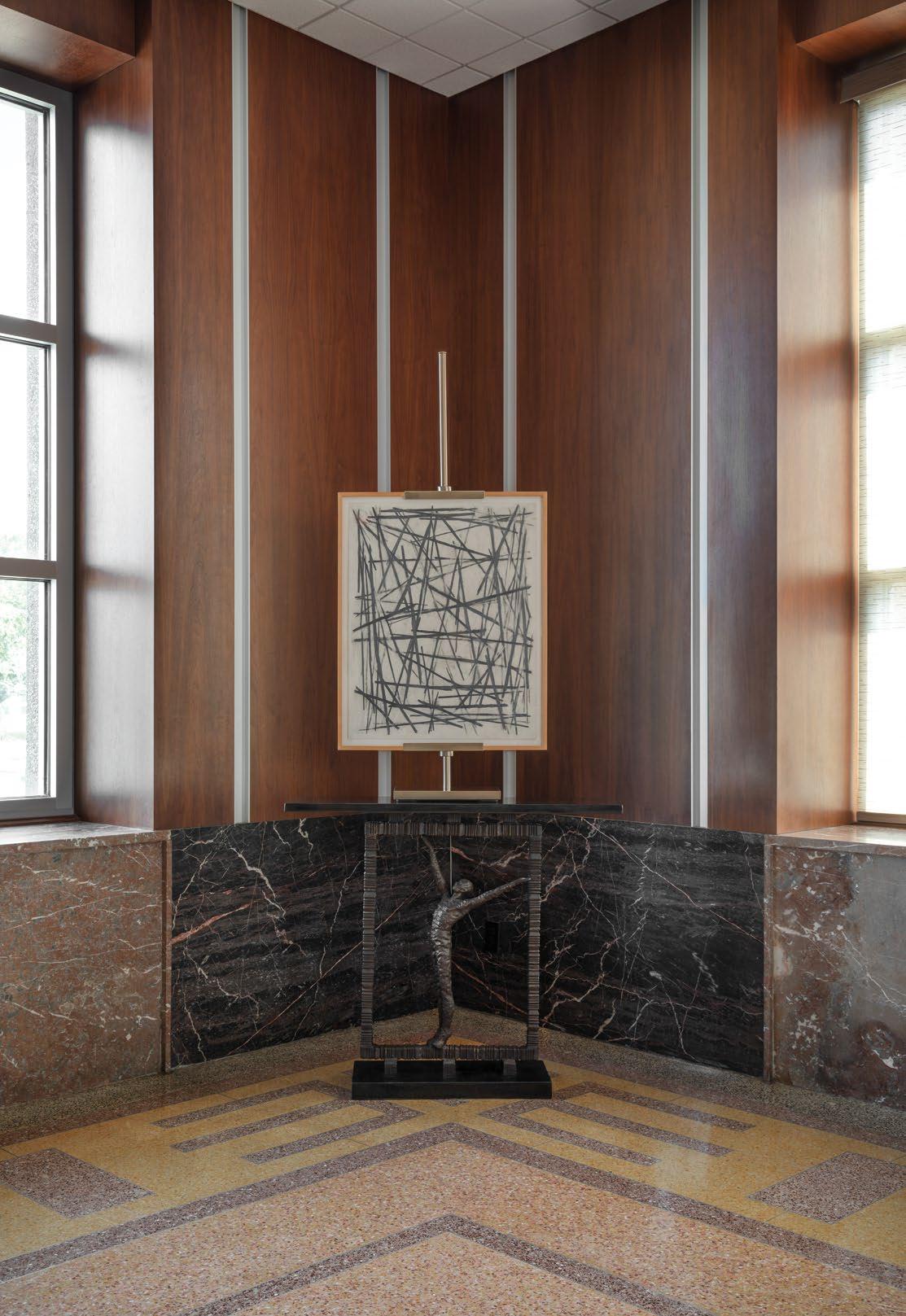 Colorful marble adorns the walls, while a painted coffered ceiling soars above. A frieze bands the space just below the ceiling and depicts 1930s-era design and construction of airplanes.