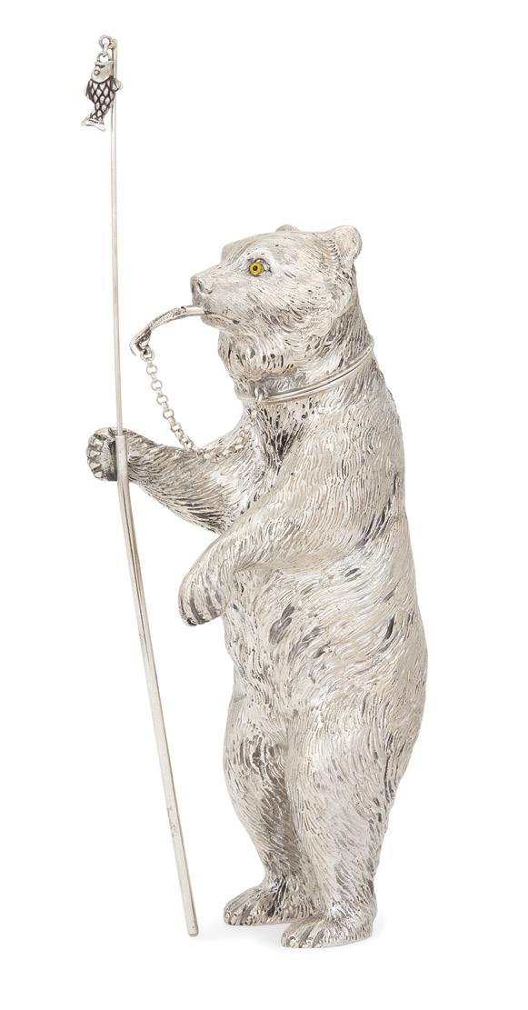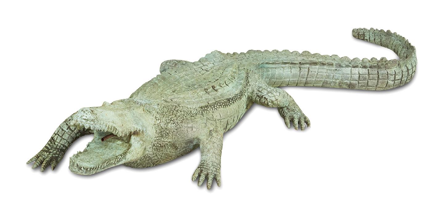 the mouth open in a menacing fashion, piped for water, the body molded with scales and curved tail, poised to attack.