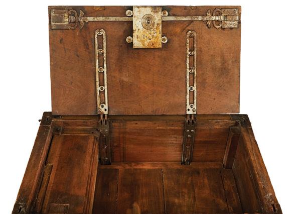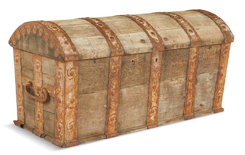 mid-19th century, the domed top mounted with large wrought iron strap hinges, the exterior with tooled metal strapwork, the interior fitted with a lidded tray.