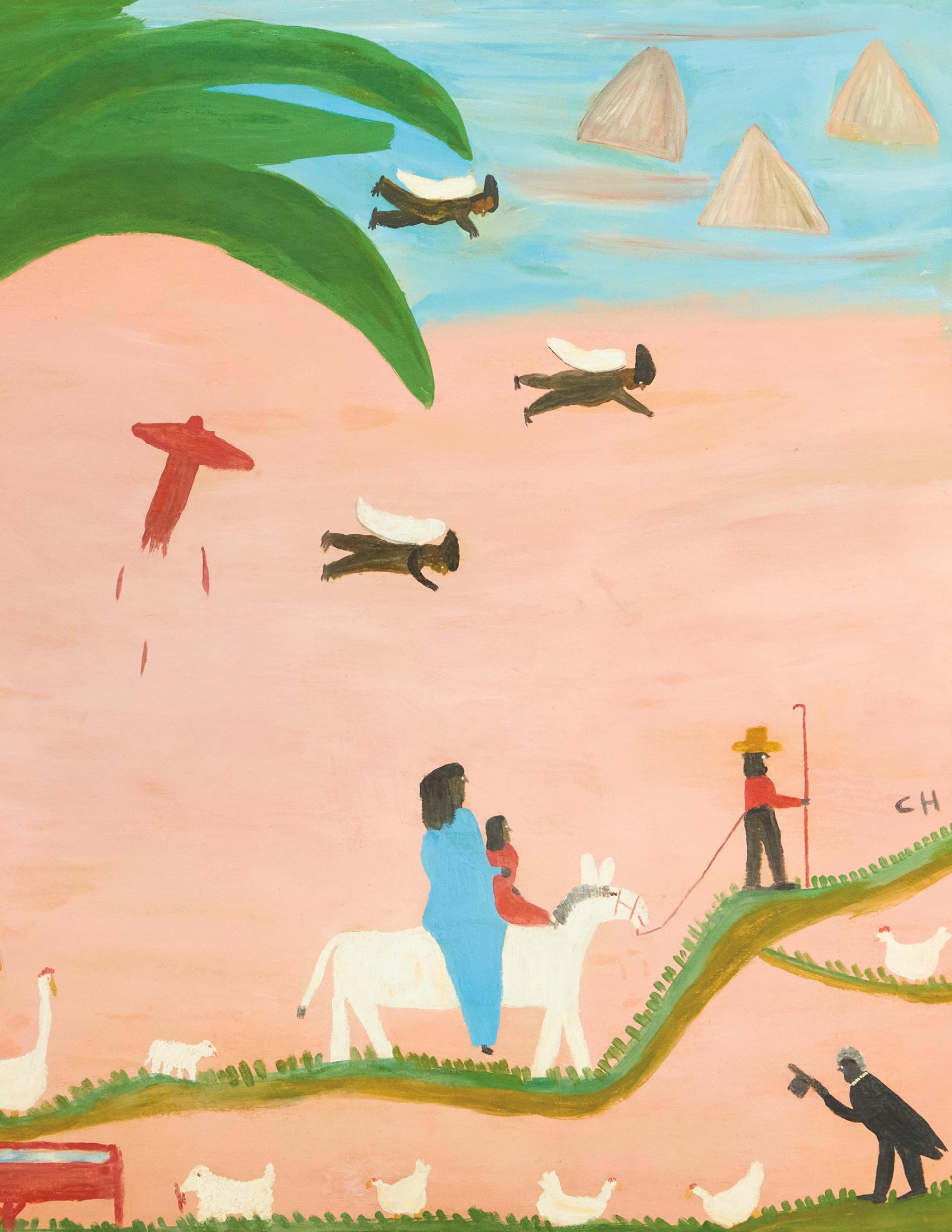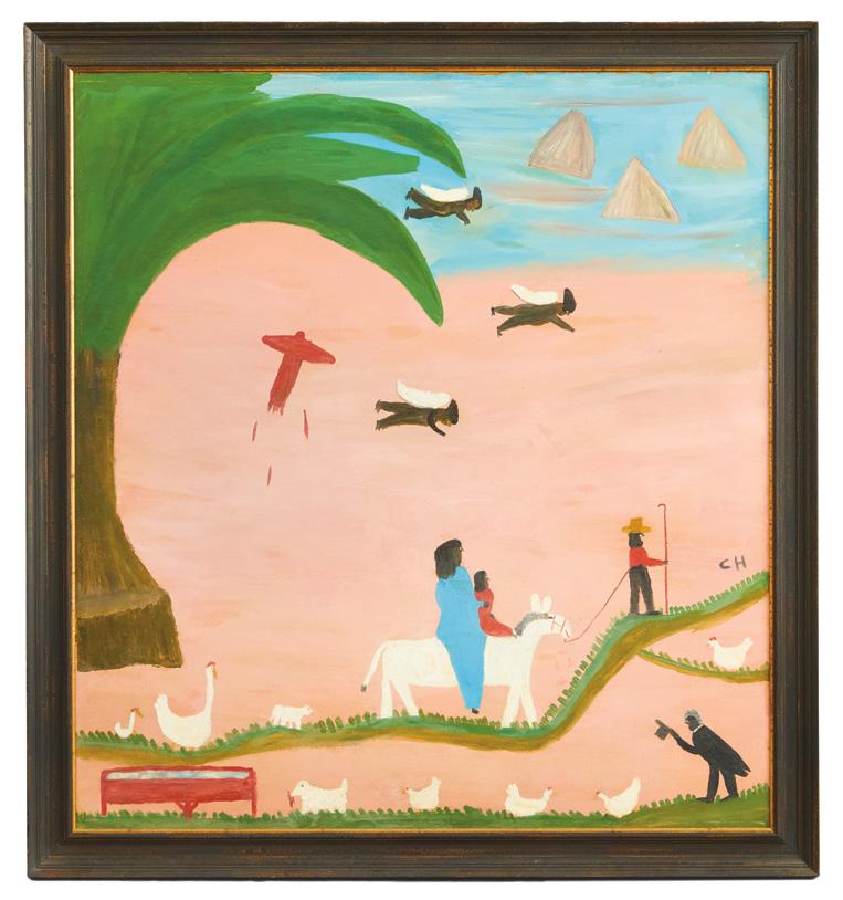 The large-scale painting “Flight into Egypt” offered here reflects Clementine Hunter’s imaginative ability to create a narrative story. The painting depicts Mary and infant Jesus riding on a mule with Joseph leading the way. In the Gospel of Matthew , an angel appears to Joseph and warns him of King Herod’s fear of the birth of an infant who would be a king of the Jews and the resultant planned Massacre of the Innocents. The angel instructed Joseph to flee to Egypt with his family. Hunter painted three African American angels flying above the family providing protection and inspiration, and a red bleeding cross in the sky which alluded to the eventual crucifixion of Jesus. In the upper right, Hunter painted three pyramids referring to the family’s safe arrival in Egypt.