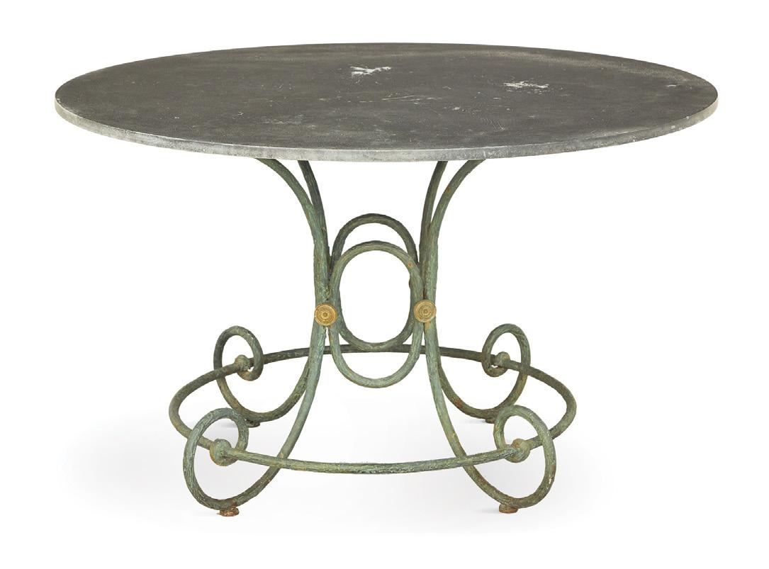 20th century, the circular polished slate top over a base with scrolled legs attached with pierced ovals and brass medallions, accented by a circular stretcher.