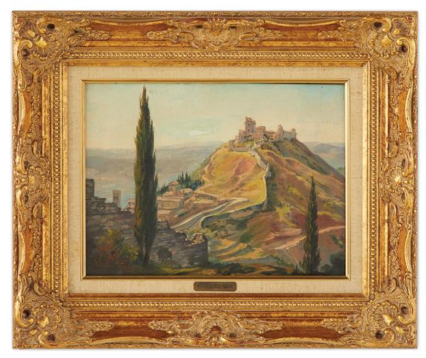 oil on board signed lower left, and “William Karges Fine Art, Beverly Hills, CA” label with artist and title en verso. Framed.