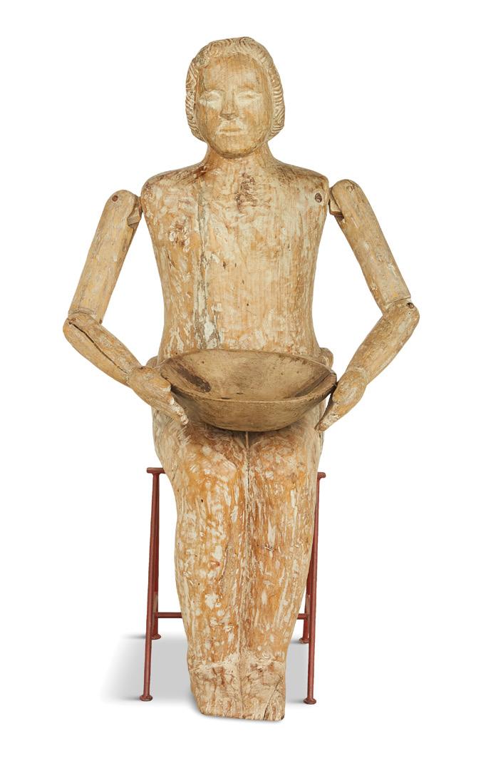 4 Brazilian Carved Wood and Metal Seated Figure figure with articulated arms, holding a votive bowl, on a painted metal stool, signed on the rear, “Oficina de Agosto”, a Sao Paulo craft workshop. h. 49”, w. 26”, d. 25”