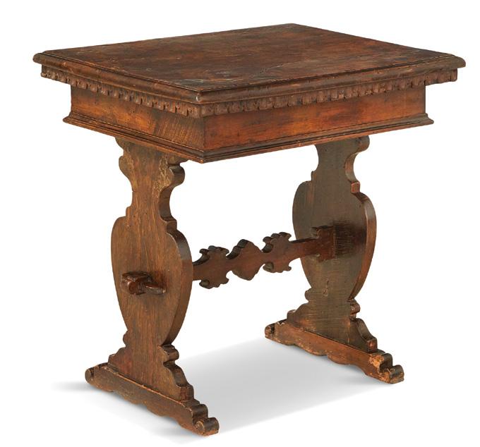 Continental Provincial Pine and Oak Trestle Table 18th century, the rectangular top with a molded edge, supported by rustic log-form trestle supports joined by a shaped stretcher and ending in shaped feet.
