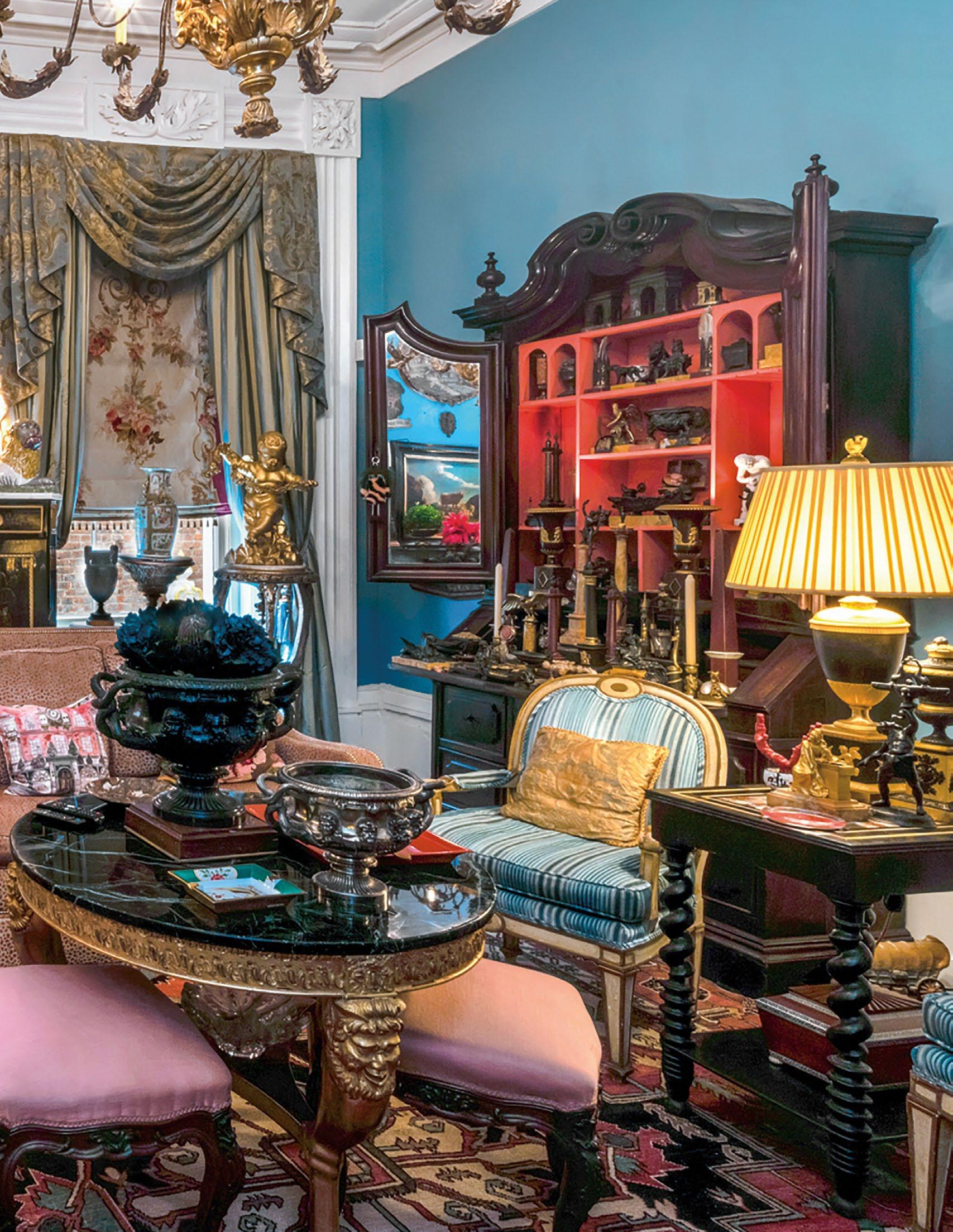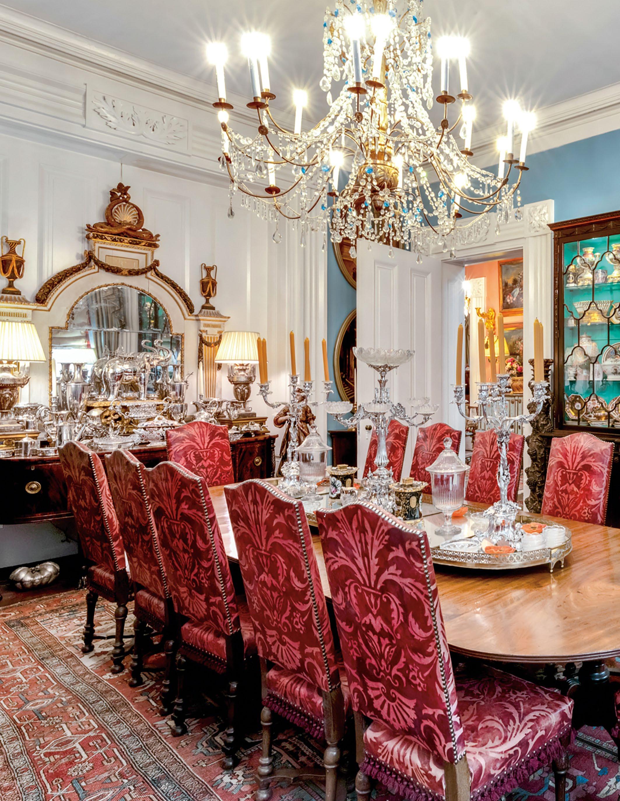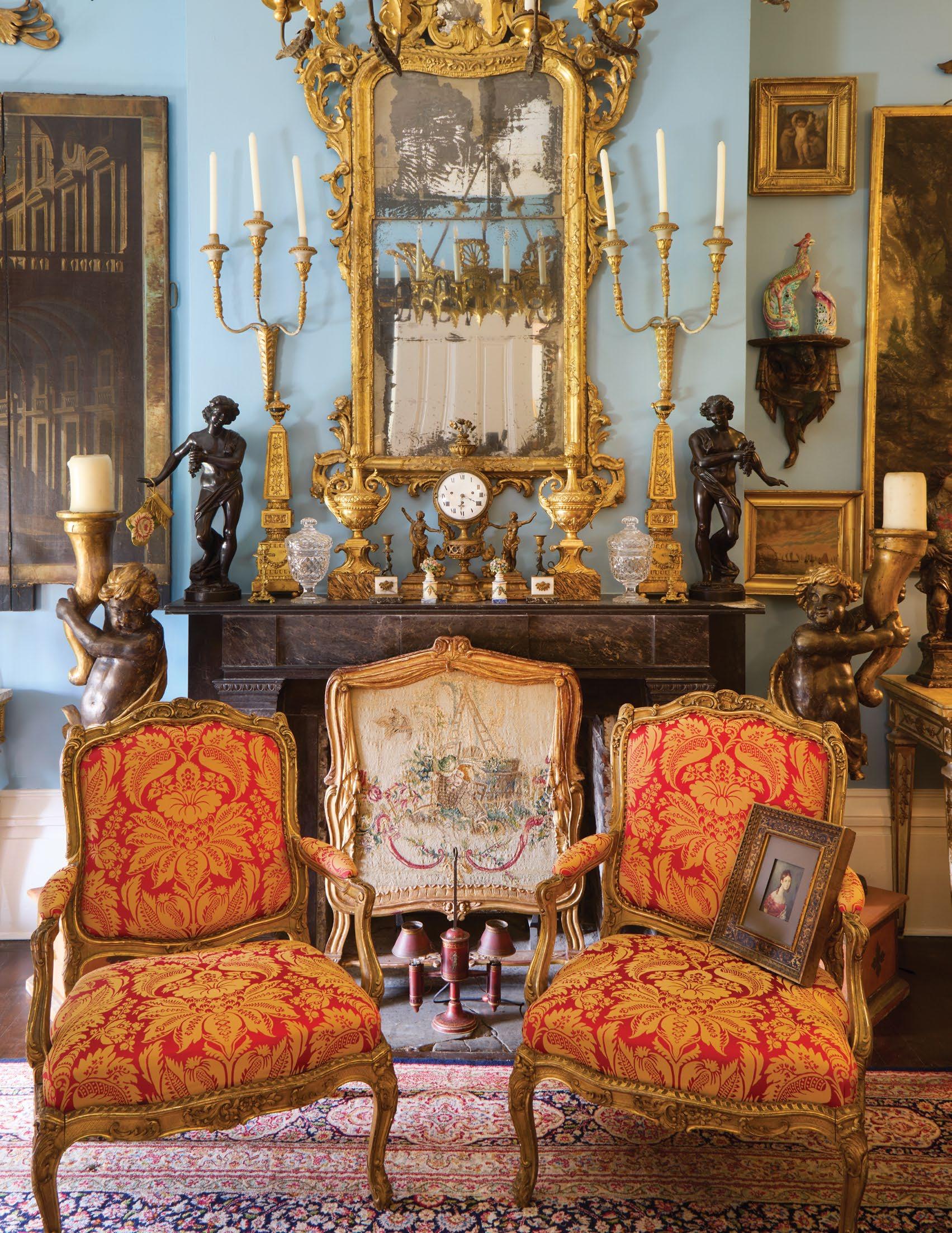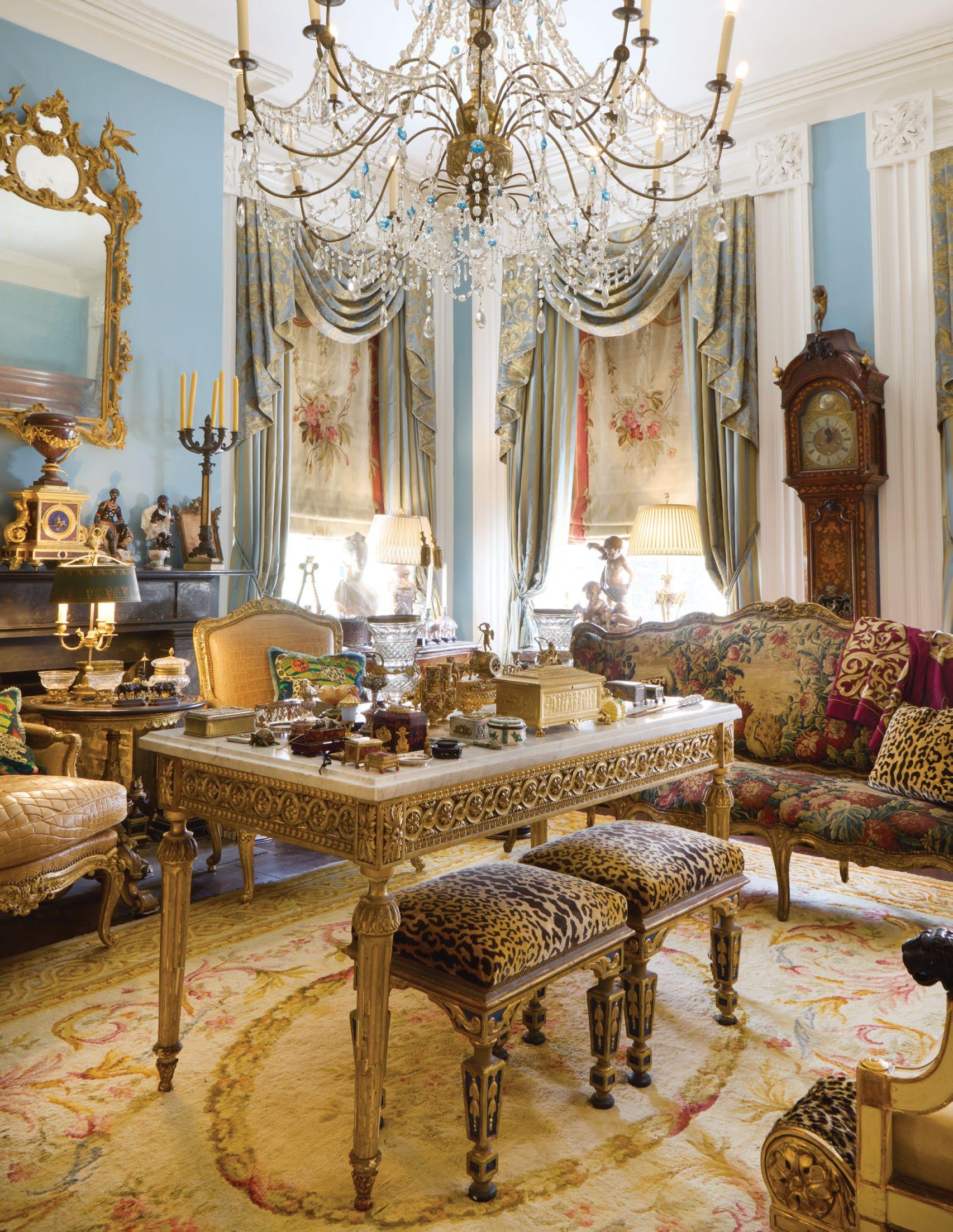 A magnificent 18th-century Genovese chandelier, one of a pair and originally unwired, served as the living room’s anchor, and Aubusson tapestries that once served as door coverings during the Napoleon III era were custom-made to be window shades for the home’s entire downstairs. All of the drapery, hand-made from Pierre Frey fabrics, was sewn by Carolyn Clark, a local seamstress. A pair of chairs in the Louis XV style, strikingly covered in alligator skin, are also among the couple’s favorite pieces once kept in their living room.