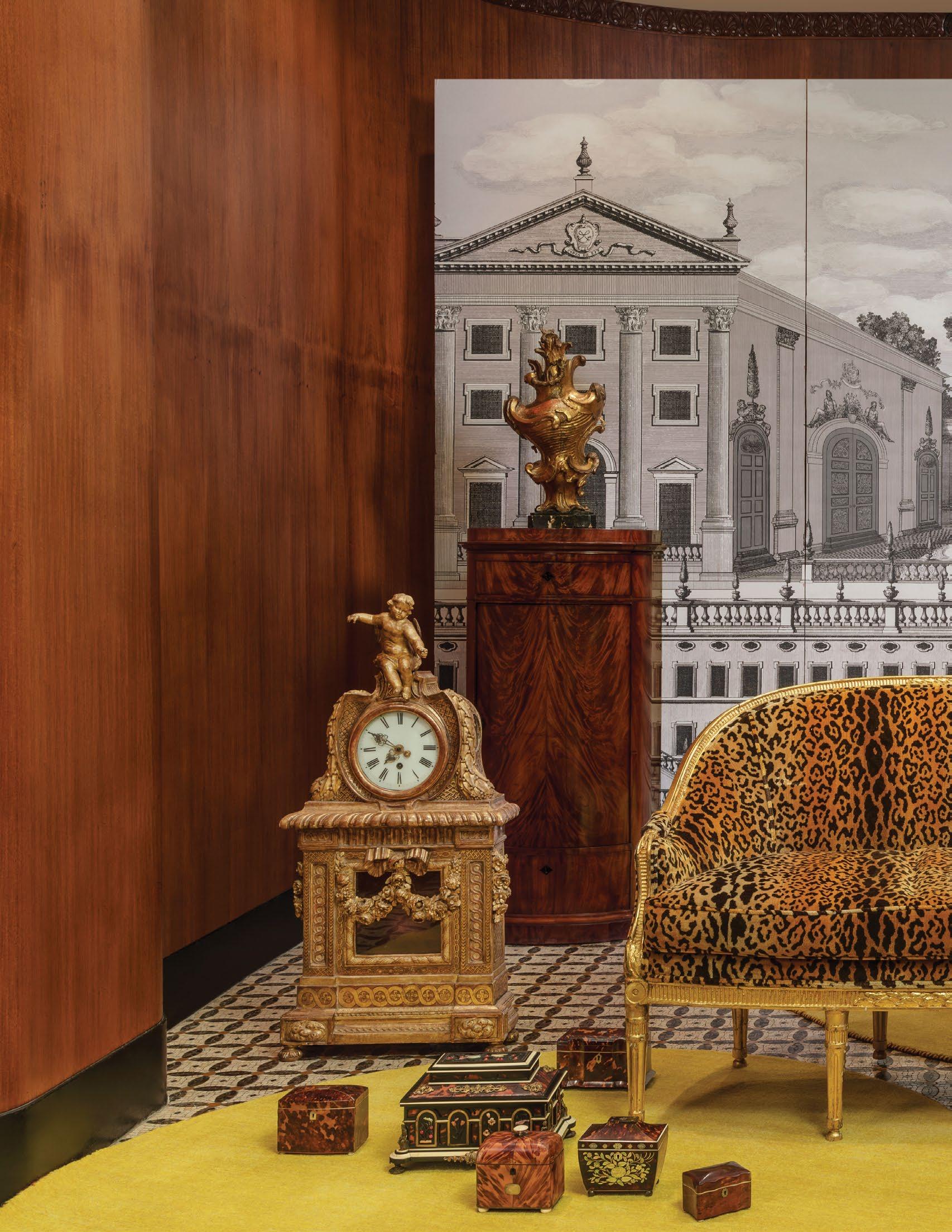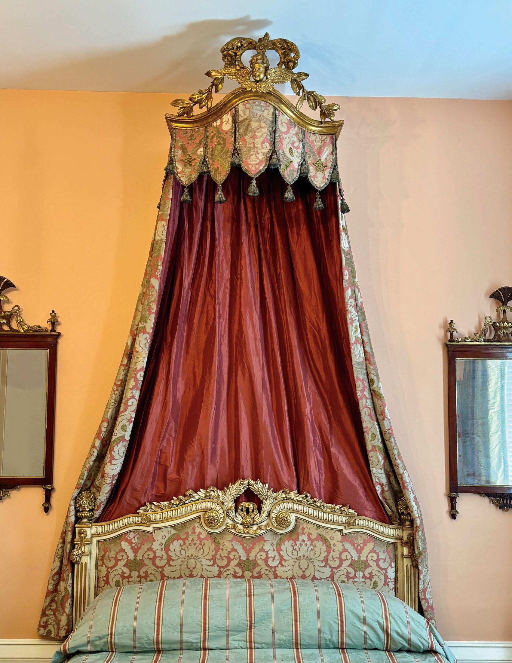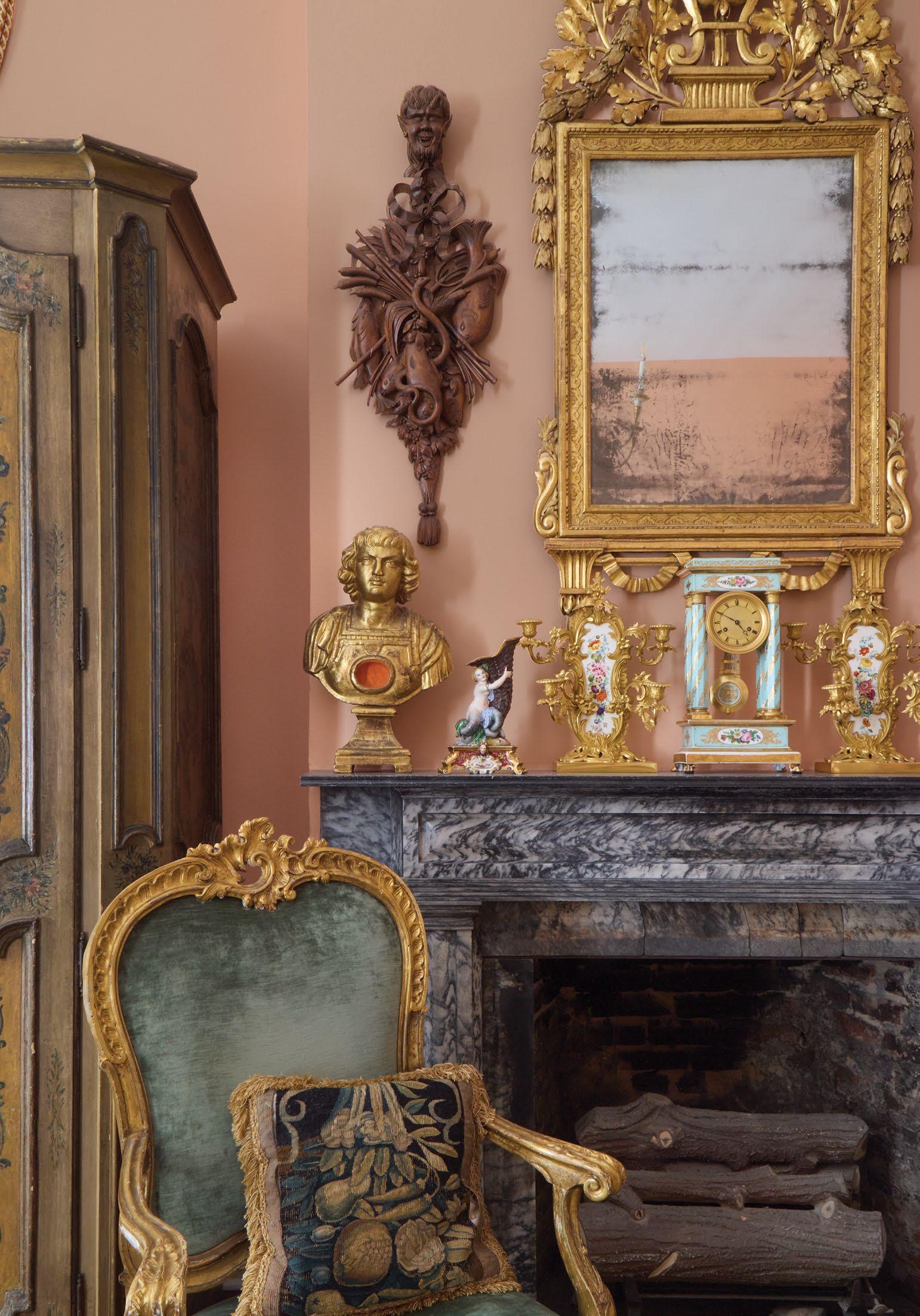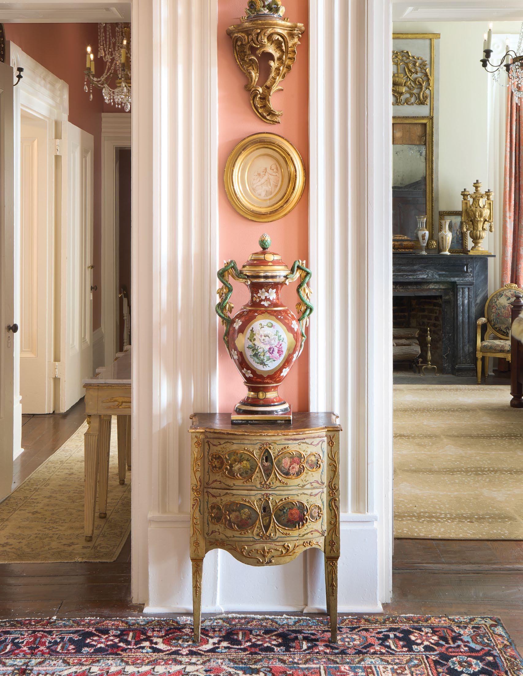 A magnificent 18th-century Genovese chandelier, one of a pair and originally unwired, served as the living room’s anchor, and Aubusson tapestries that once served as door coverings during the Napoleon III era were custom-made to be window shades for the home’s entire downstairs. All of the drapery, hand-made from Pierre Frey fabrics, was sewn by Carolyn Clark, a local seamstress. A pair of chairs in the Louis XV style, strikingly covered in alligator skin, are also among the couple’s favorite pieces once kept in their living room.