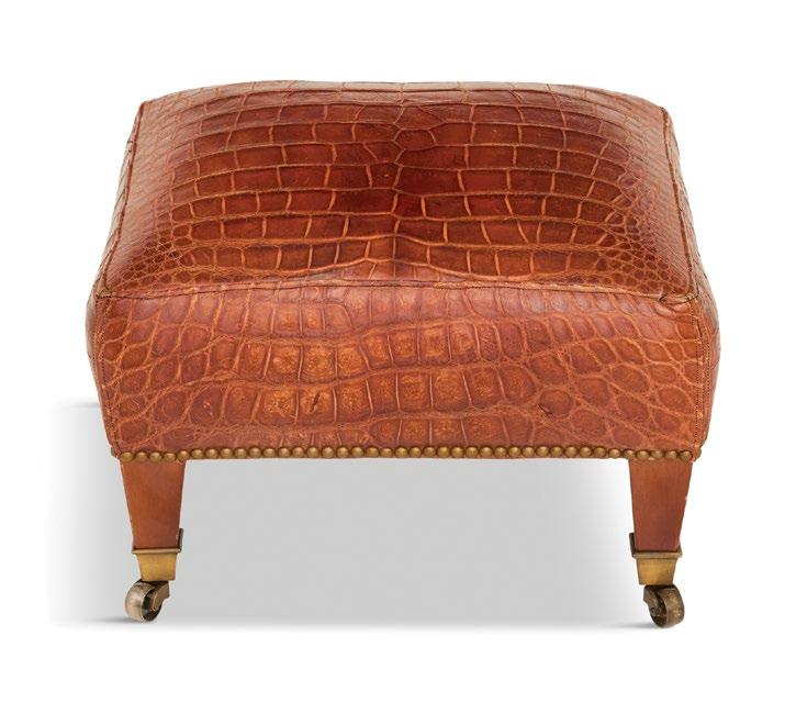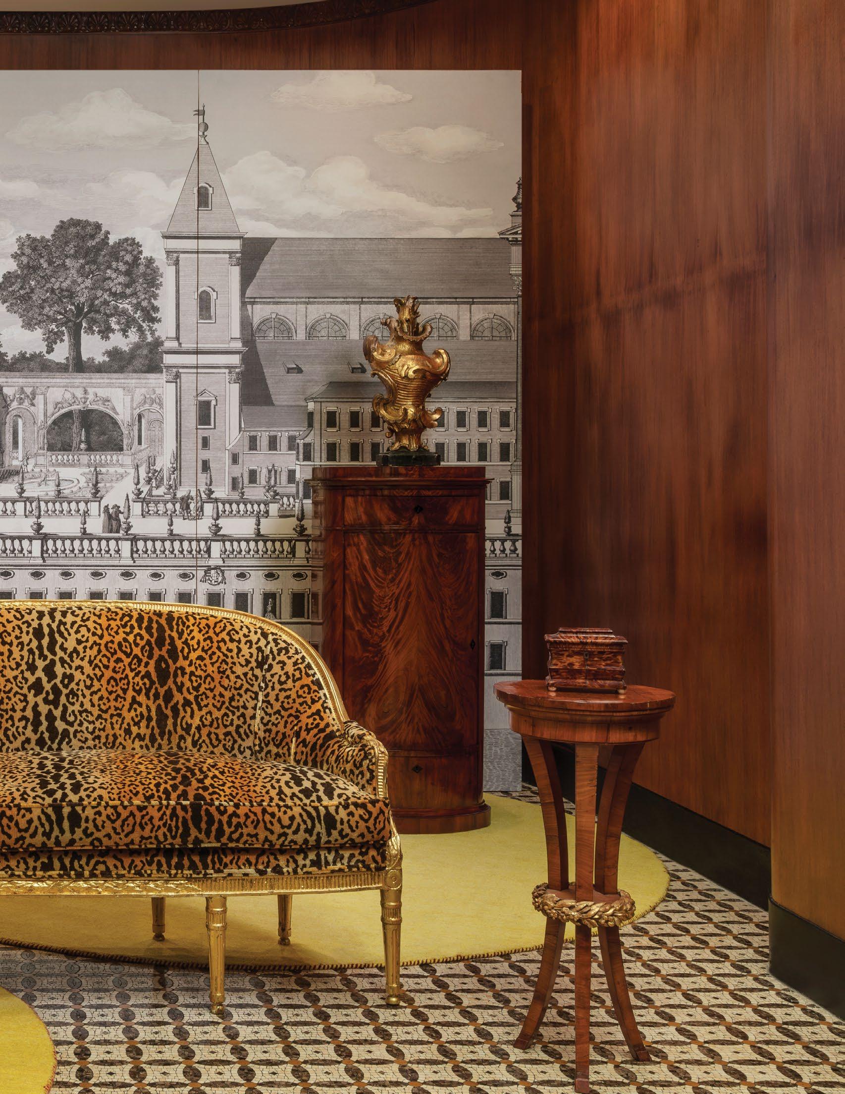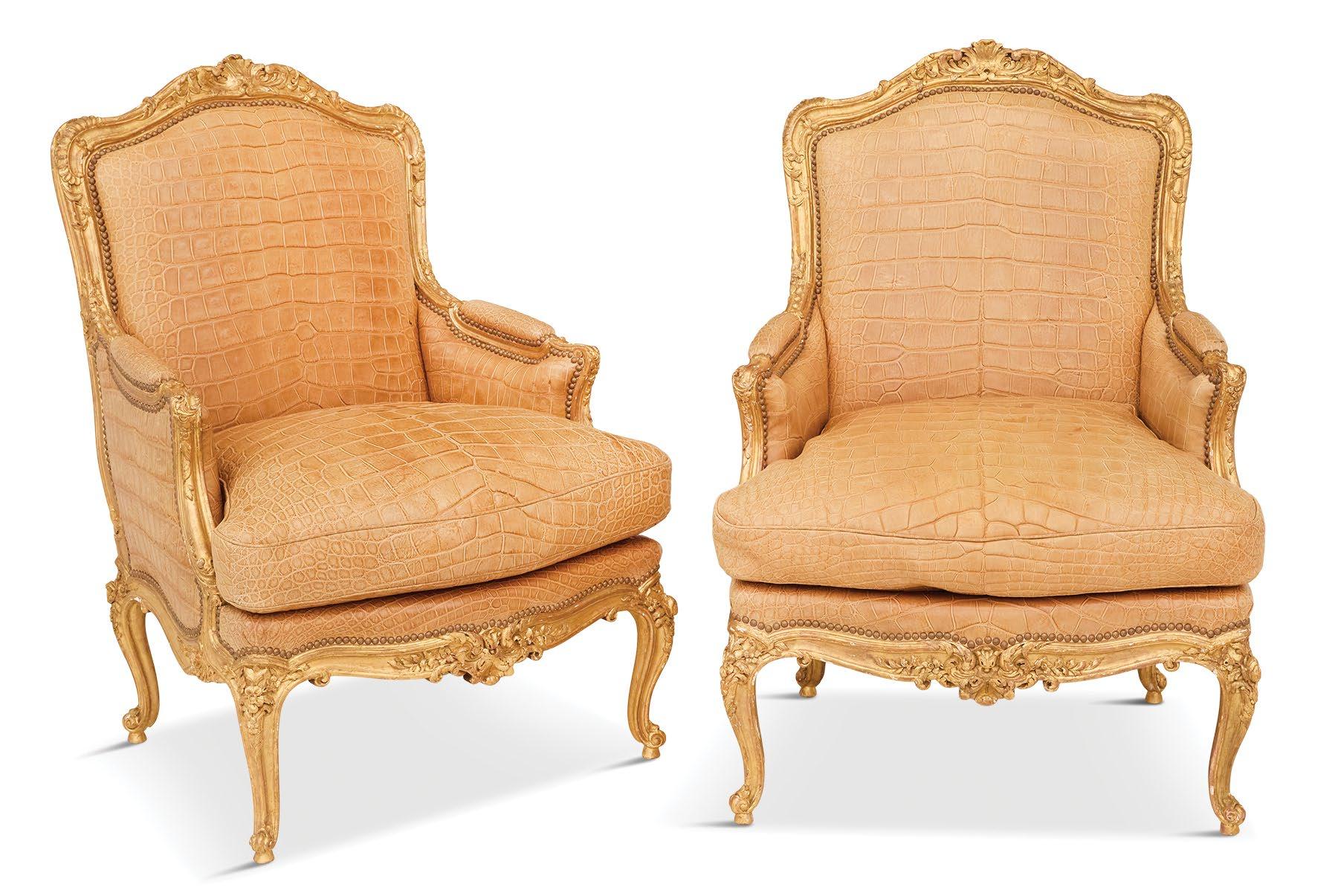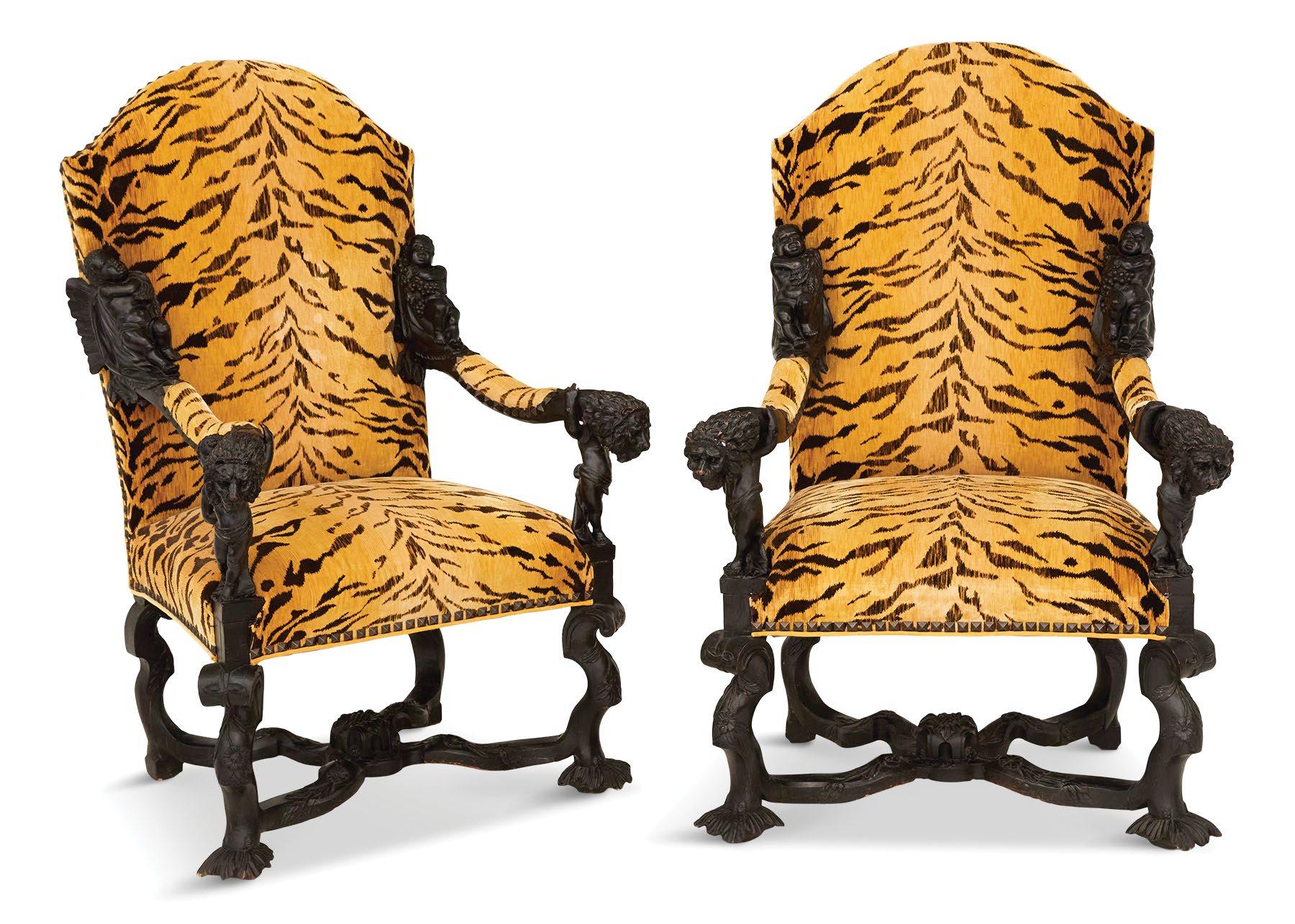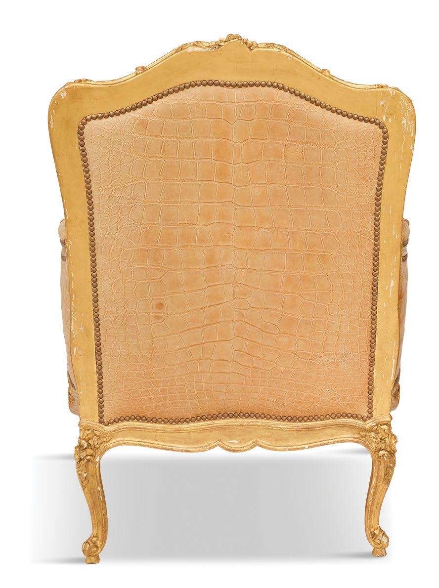 A magnificent 18th-century Genovese chandelier, one of a pair and originally unwired, served as the living room’s anchor, and Aubusson tapestries that once served as door coverings during the Napoleon III era were custom-made to be window shades for the home’s entire downstairs. All of the drapery, hand-made from Pierre Frey fabrics, was sewn by Carolyn Clark, a local seamstress. A pair of chairs in the Louis XV style, strikingly covered in alligator skin, are also among the couple’s favorite pieces once kept in their living room.