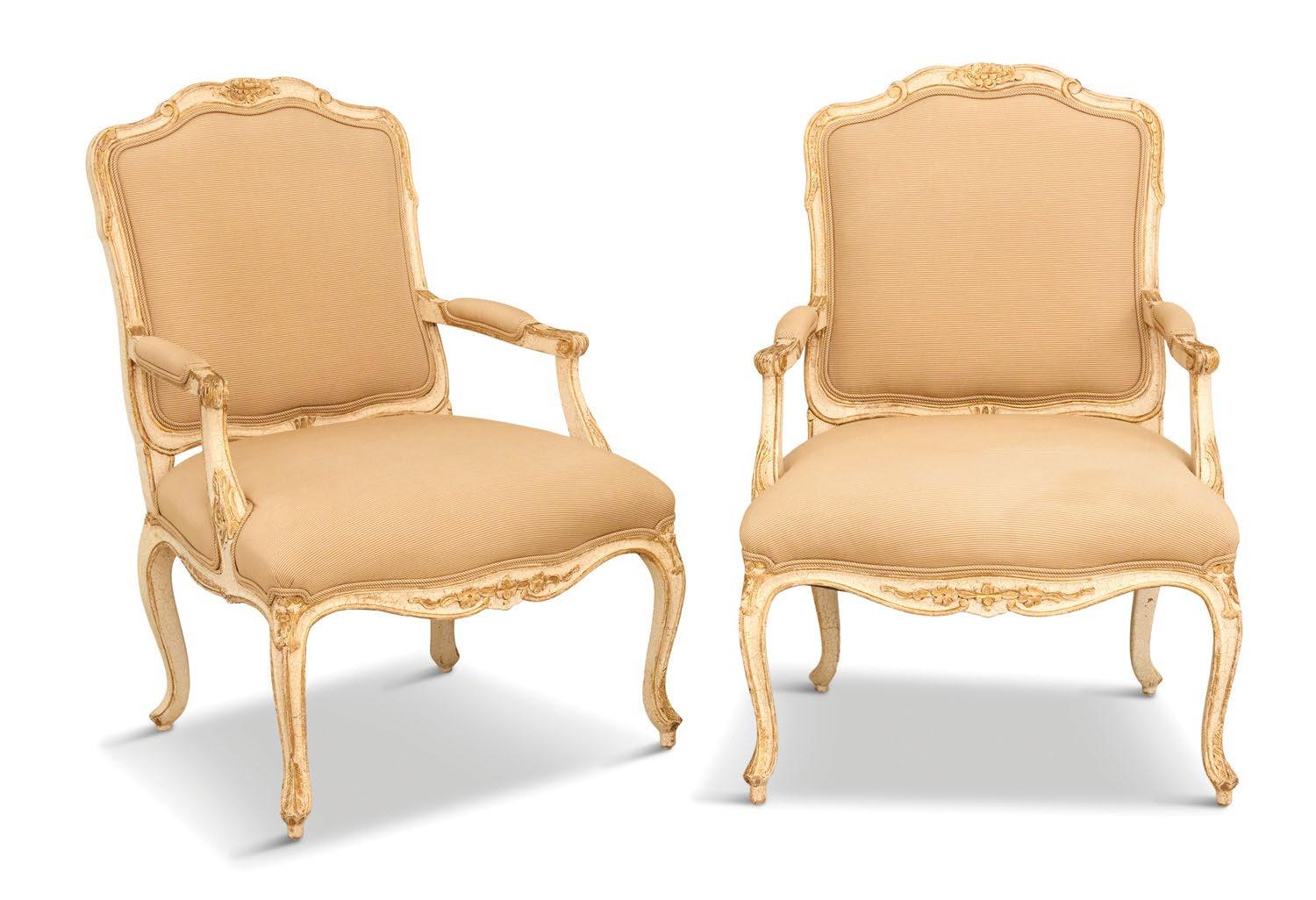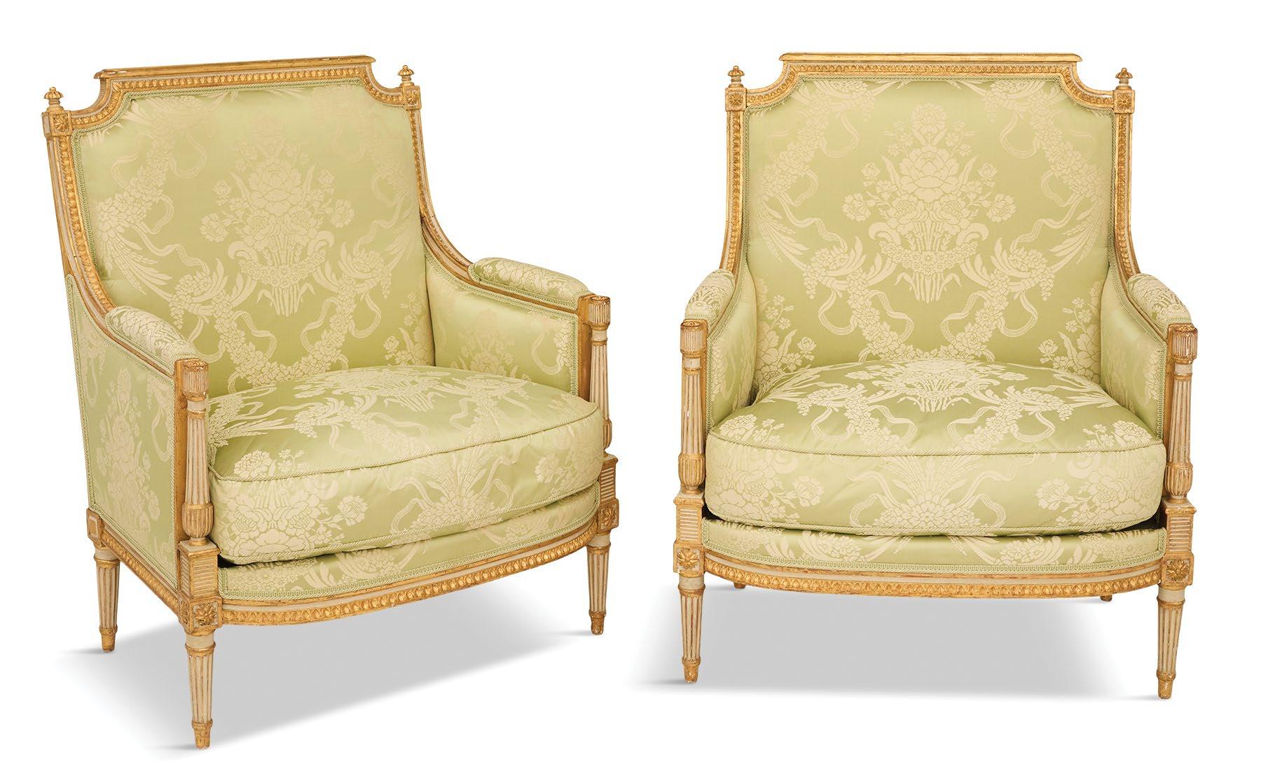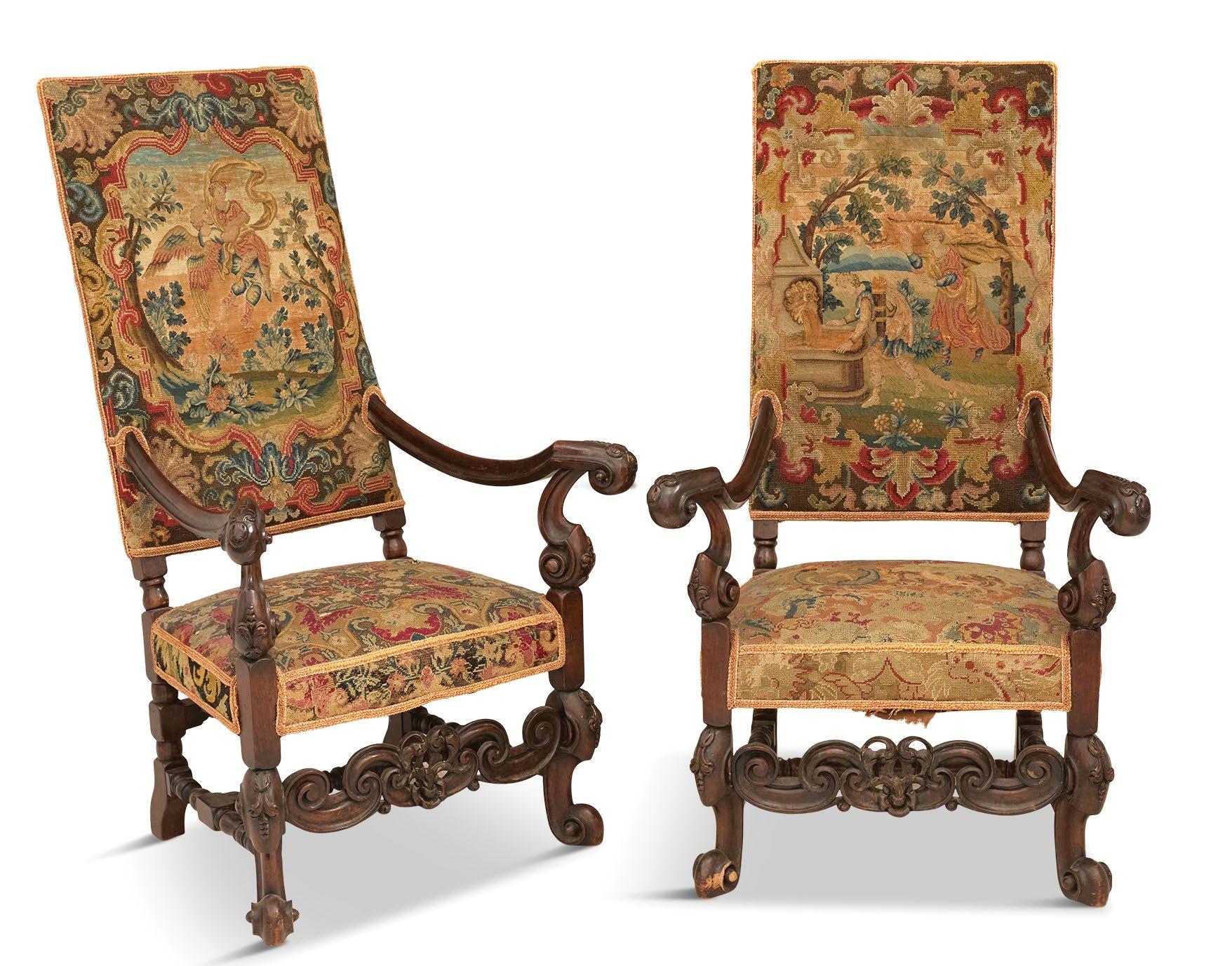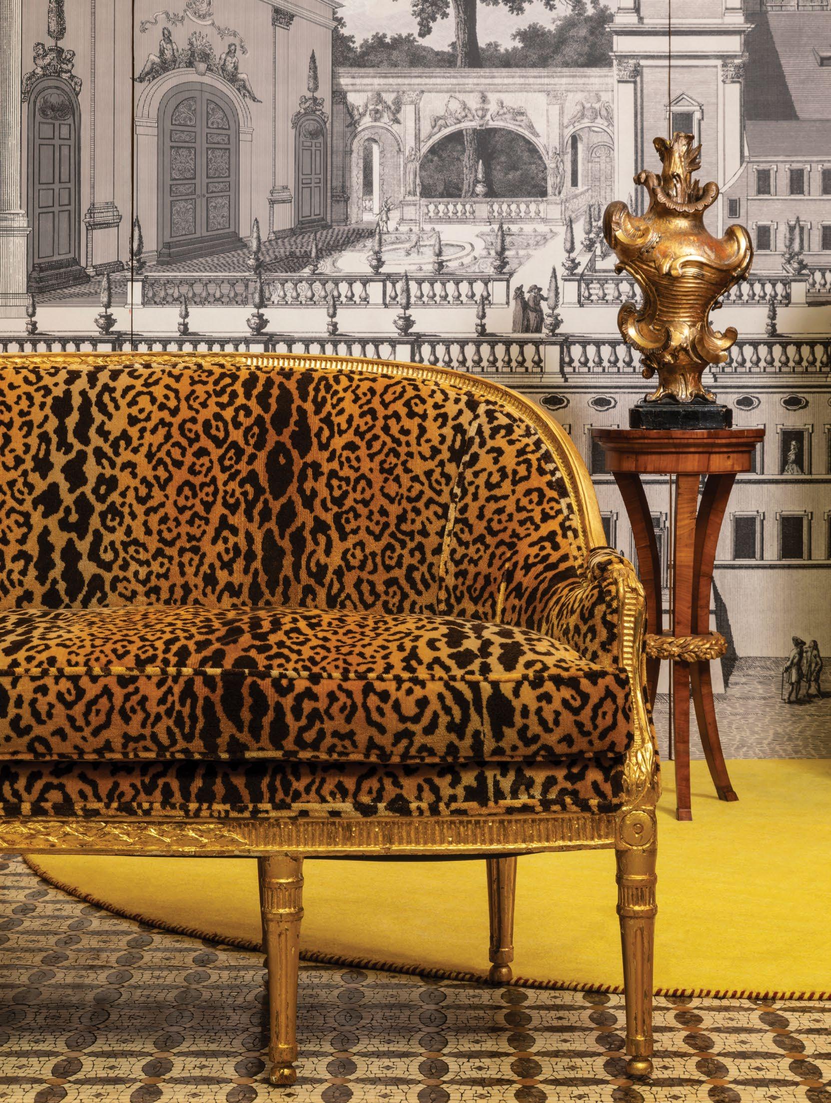 A magnificent 18th-century Genovese chandelier, one of a pair and originally unwired, served as the living room’s anchor, and Aubusson tapestries that once served as door coverings during the Napoleon III era were custom-made to be window shades for the home’s entire downstairs. All of the drapery, hand-made from Pierre Frey fabrics, was sewn by Carolyn Clark, a local seamstress. A pair of chairs in the Louis XV style, strikingly covered in alligator skin, are also among the couple’s favorite pieces once kept in their living room.