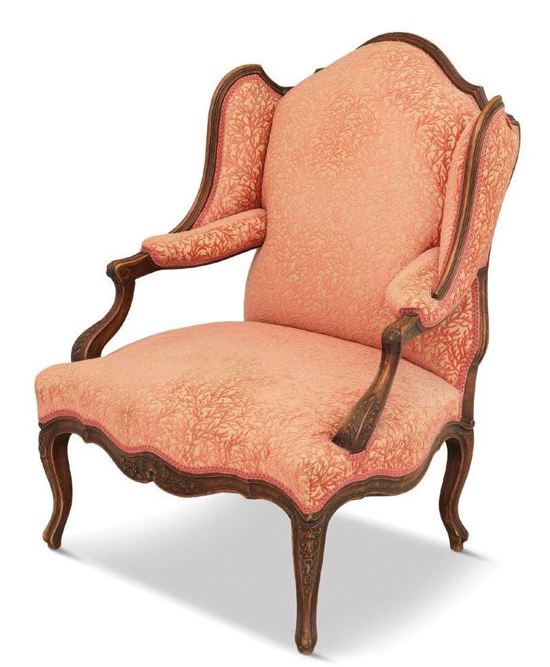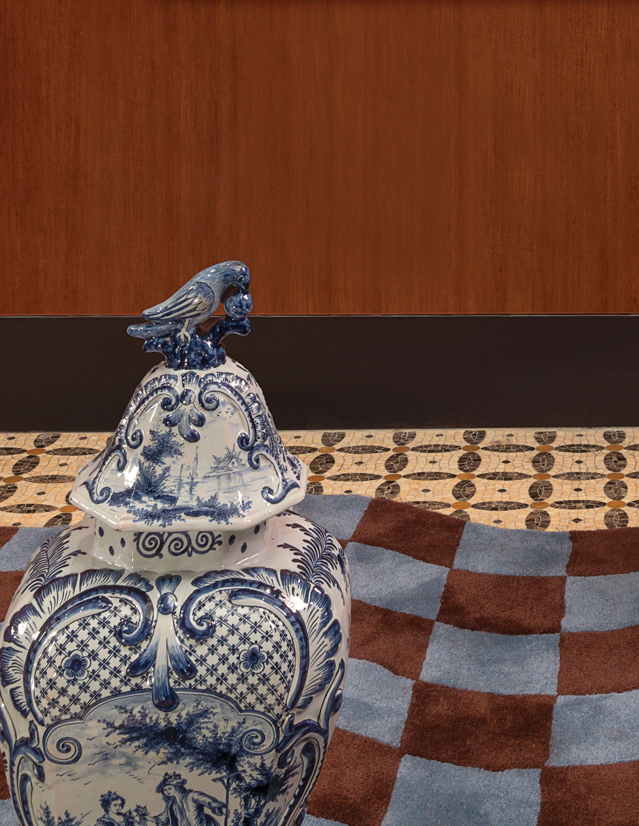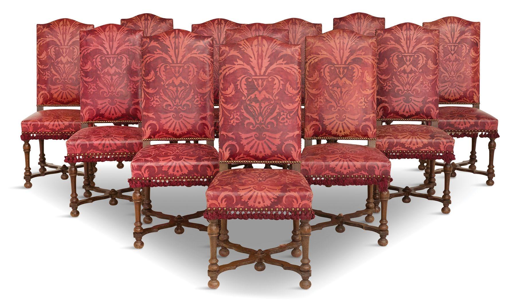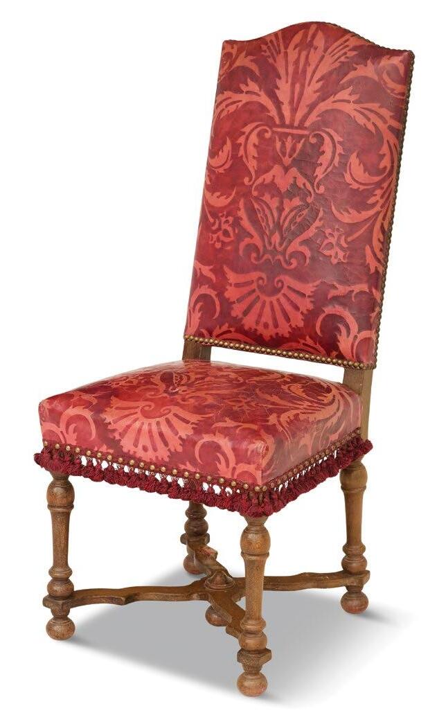 In the dining room, anchored by the second Genovese chandelier, the couple showcased their extensive collection of porcelain, from Delft and Old Paris to Derby, in a majestic Irish breakfront cabinet. One of Stone’s most special acquisitions was also kept in this room: a set of 12 European Oak chairs with custom leather coverings by Fortuny, likely the venerable Venetian fabric house’s only leather pattern ever produced. Stone first fell in love with them at a dinner party in Italy and, after much persistence and patience, purchased them years later.
