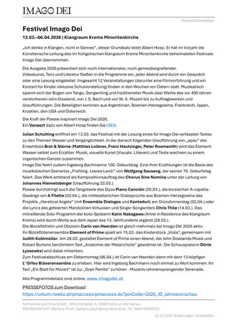 Nö Festival und Kino GmbH., Minoritenplatz 4, 3500 Krems an der Donau, PRESSEKONTAKT: Barbara Pluch, barbara.pluch@noe-festival.at; Tel: 0664 60499332 15.12.2025 Änderungen vorbehalten