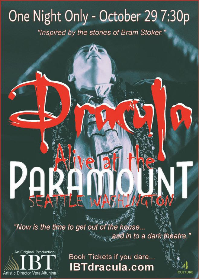 (PERFORMANCE) For one night only, the International Ballet Theater will treat Seattle to a production of Bram Stoker’s classic vampire tale Dracula, featuring opulent gothic costumes, jaw-dropping choreography, and a haunting score by composers Charles Gounod, Astor Piazzolla, and George Enescu. For this special opening night performance, Count Dracula himself invites all audience members to wear their Halloween costumes to the show. Those who impress the Count may even summon his presence. (Paramount Theatre, 7:30 pm, all ages) AUDREY VANN
