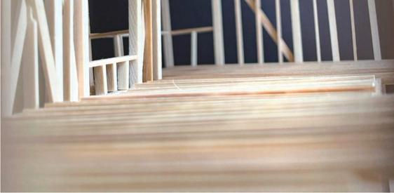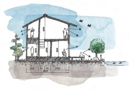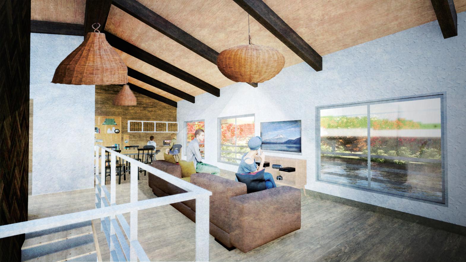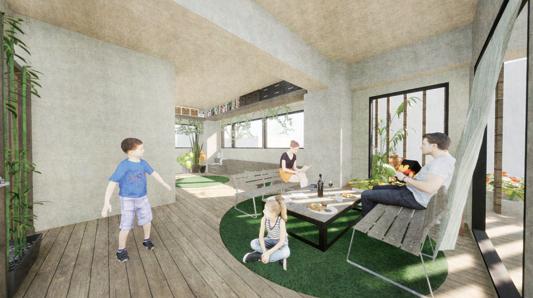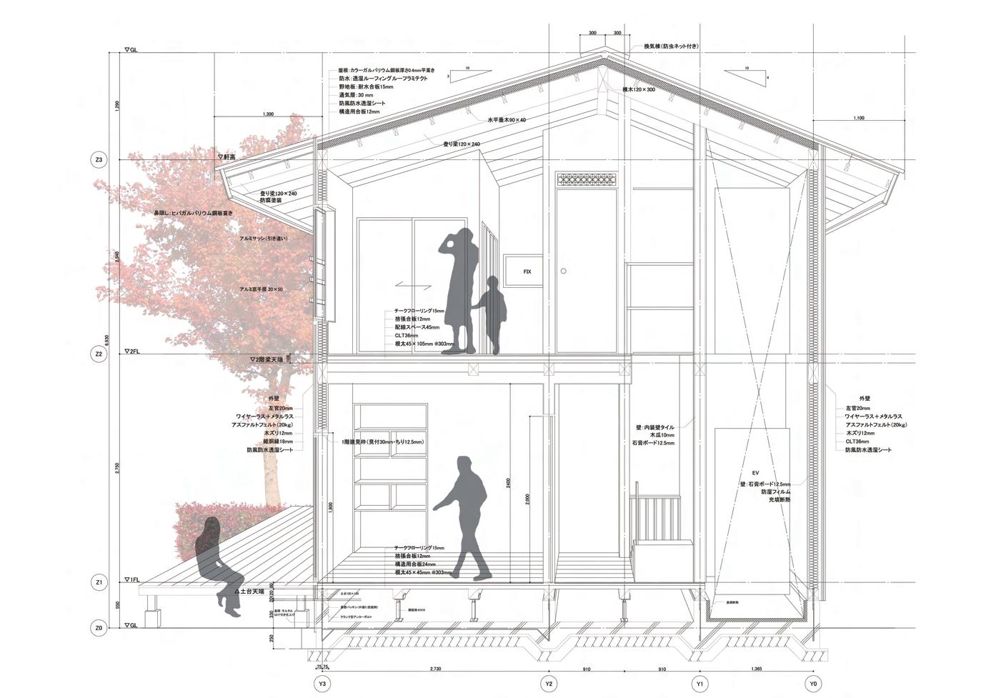 3世帯同居の住宅は1階をプライベートな空間と し、2階を共有空間とした。1階に寝室などを設け ることで災害時の避難のしやすさや祖母を介護する ときの移動のしやすさを実現した。 2階の共有空間に関しては外部からの視線を気に せず生活することができ、日当たりの良い空間で雲 場池を一望することができる。