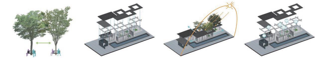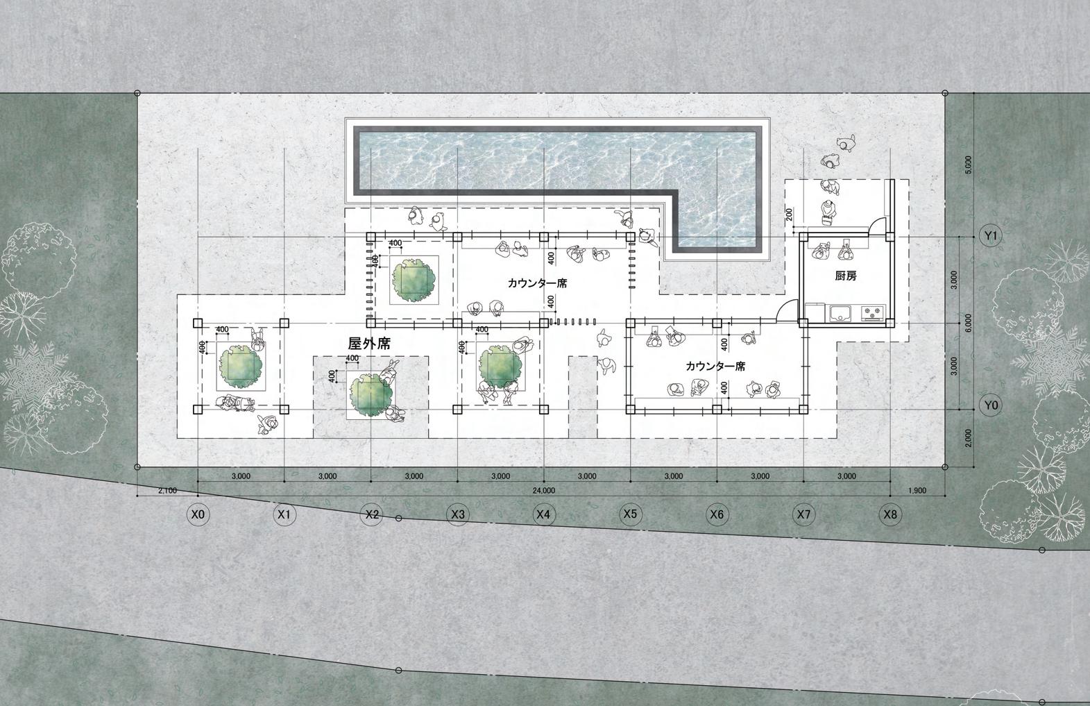 カウンターは従来のテーブル席に比べゆっくりくつろげるこ とが難しい為、1人あたりの滞在時間が短いことを推測し、それ により人が密集することを避けることができる。座れる席は屋 外席のみで自生している樹木の間隔に合わせて席を設けている 為、人と人との距離を保ちながら飲食することができる。また 屋外席のため空気が溜まることなく、循環しているため感染リ スクを抑えることができる。