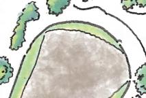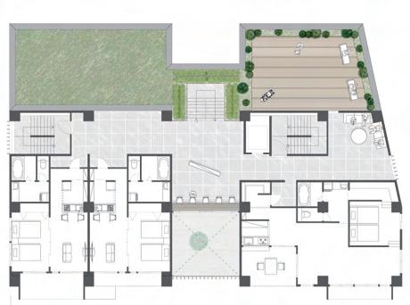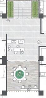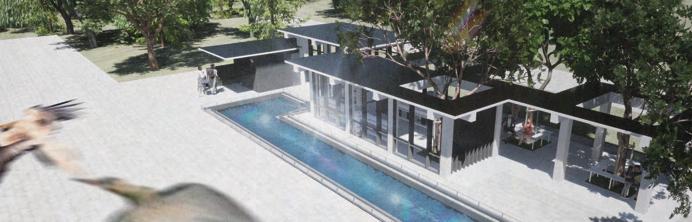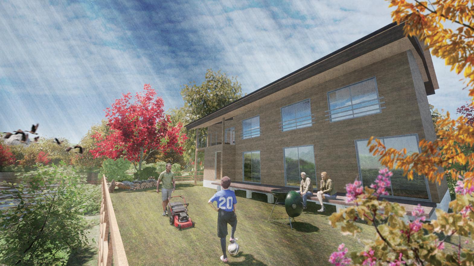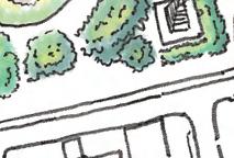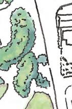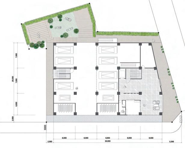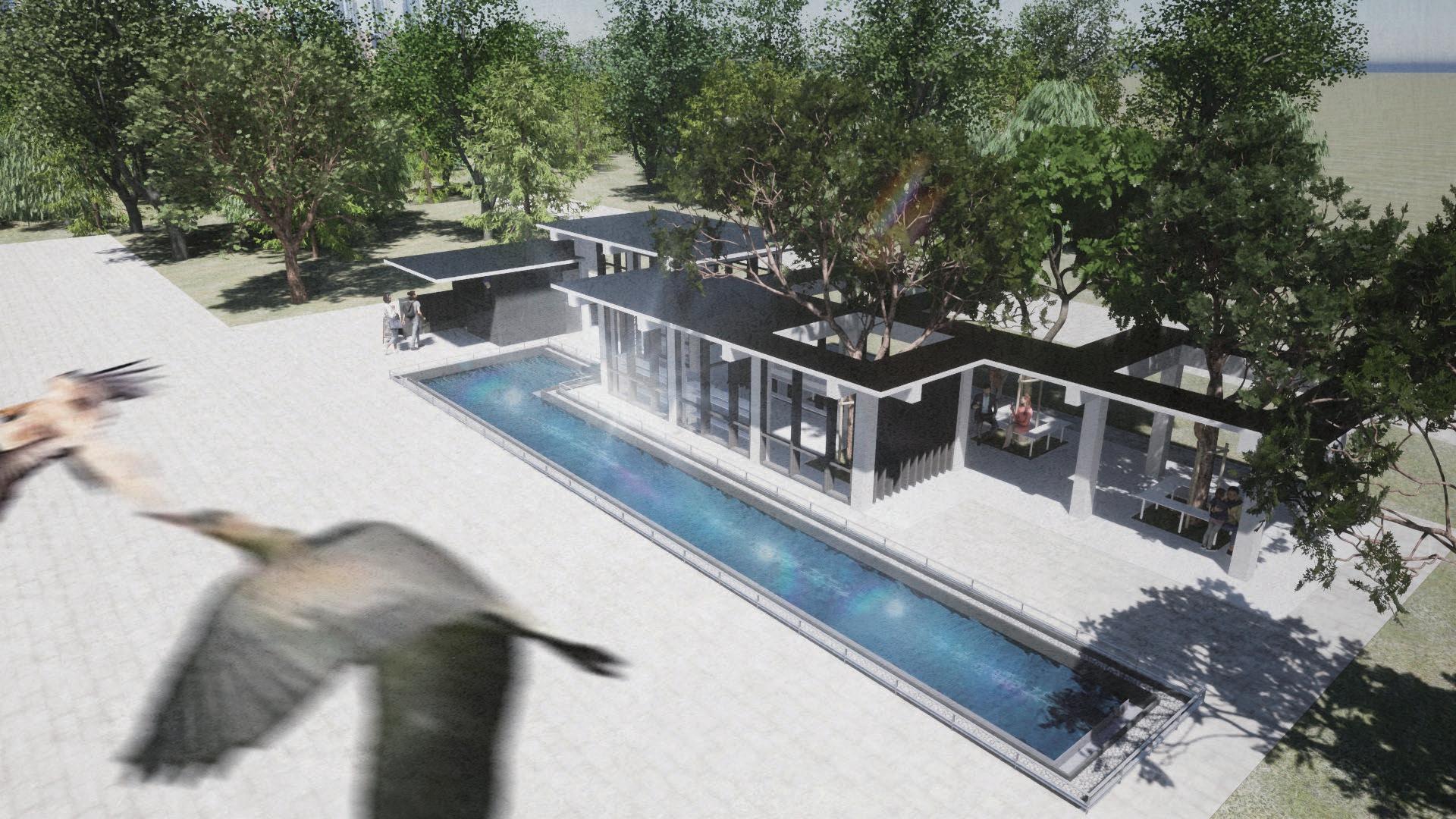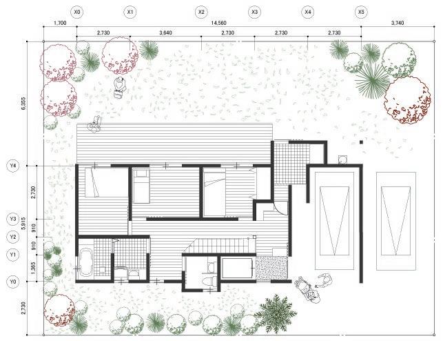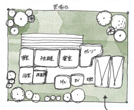 敷地の西面には雲場池の広がる良好な眺めがあ る。その眺めを一望するため、雲場池からある程度 距離を保ち、庭を広く設けた。その庭ではスポーツ やBBQなどのアクティビティが生まれる。 建物周辺には四季折々の植物を植え、回遊性を持 たせることで四季の移ろいを楽しむことができる。