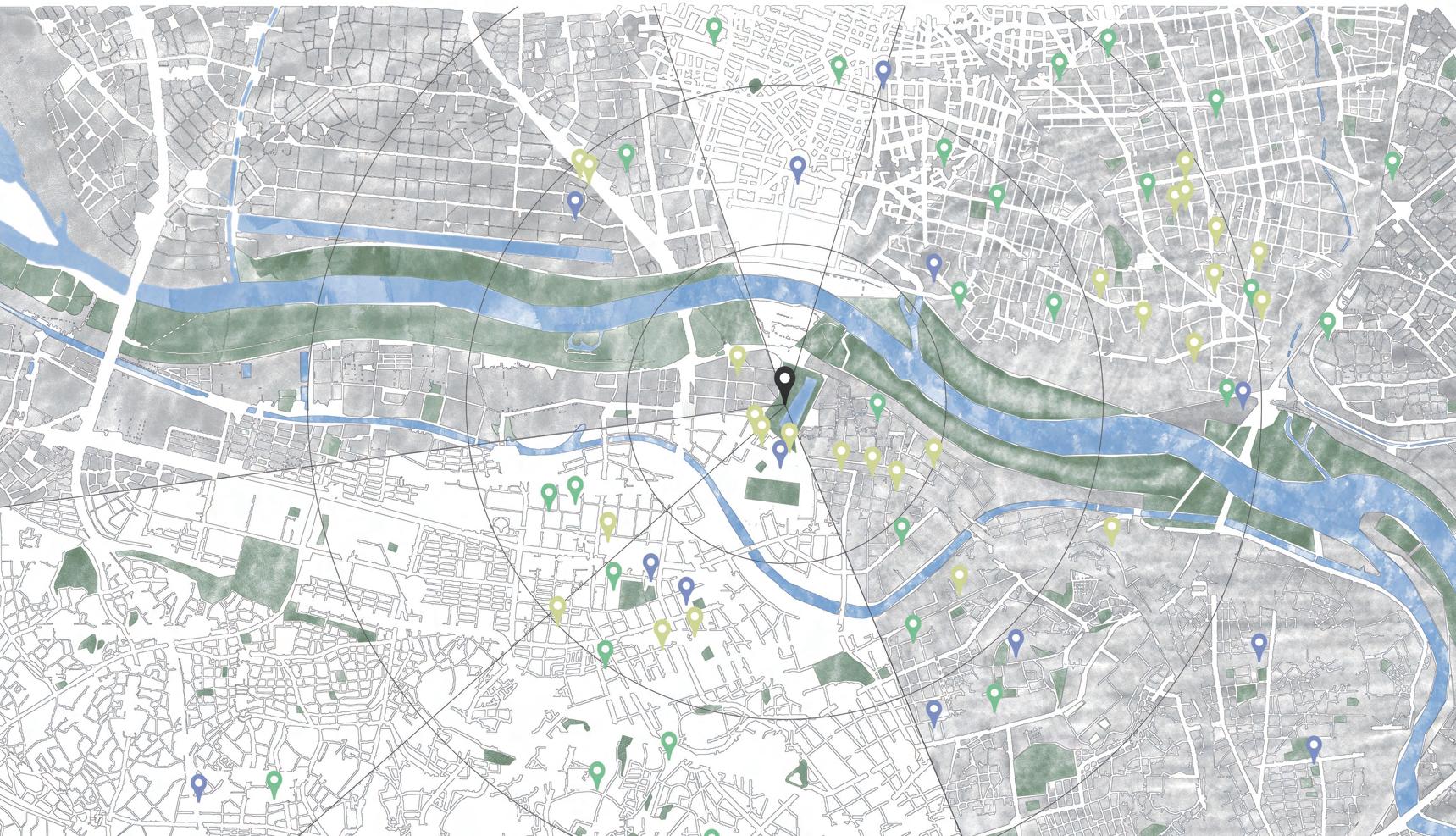 浮間公園は非常に多くの子供たちとその保護者が集まりあそんでい る。サッカーやバスケ、キャンプをしている人や釣りをしている人 屋外ならではの遊びをしている。 なぜこの公園はそれほど賑わうのだろうか。調べると多くの教育 施設が点在している。図中の円は半径1kmごとに記されている。