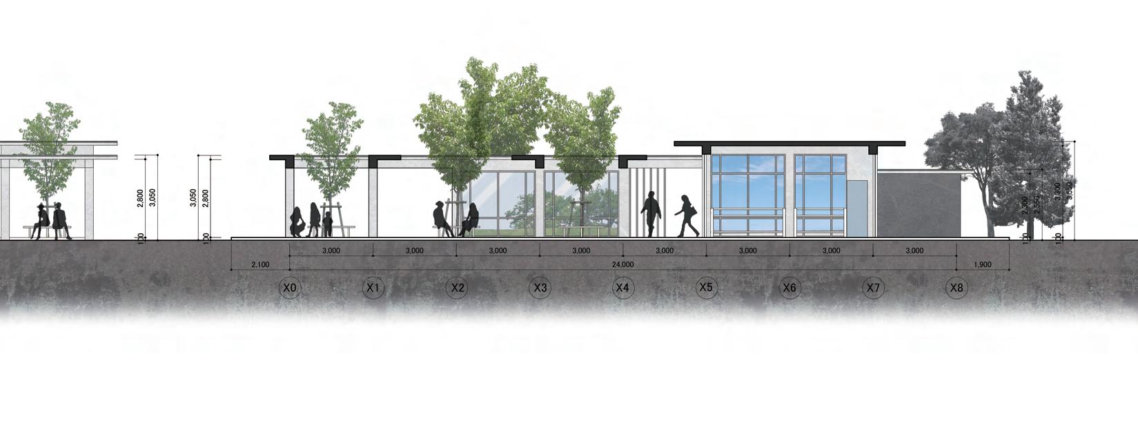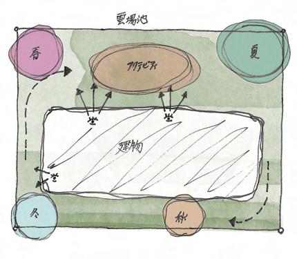 四季がはっきりと分かれているのは日本の特徴で ある。このような自然豊かな敷地では四季の変化が より鮮明で明確に分かる。 周辺環境の特性をより生かすため四季の代表的な 植物から幾つかピックアップし、建物周辺に植えた。 またそれらの植物は一か所に集中させることなく、 全体に分散させて緩やかな繋がりを持たせる。