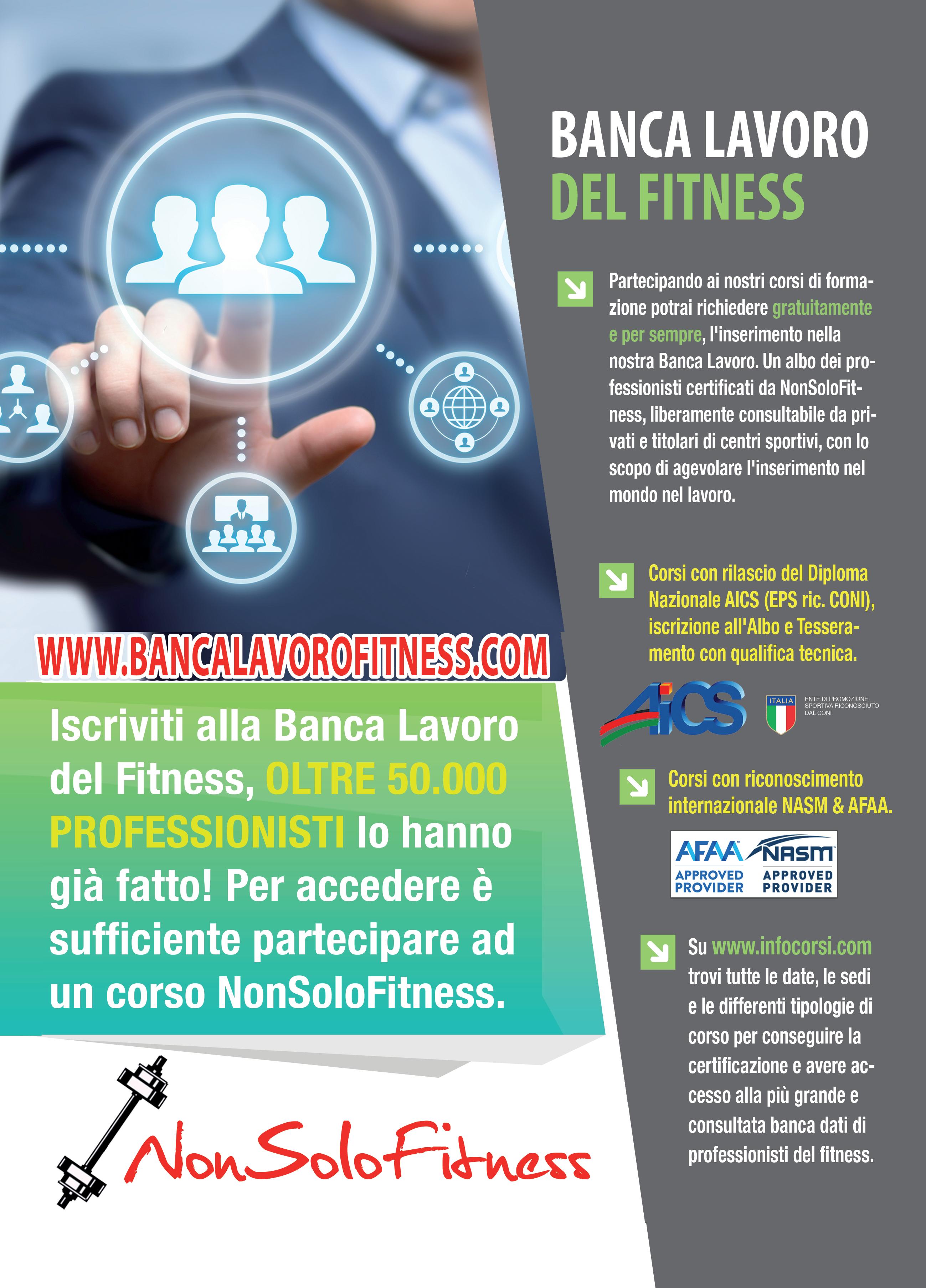 Banca lavoro del fitness: Al termine del corso, i partecipanti, potranno richiedere gratuitamente e per sempre, l’inserimento nella Banca Lavoro del Fitness. Un albo dei professionisti certificati da NonSoloFitness, liberamente consultabile da privati e titolari di centri sportivi, con lo scopo di agevolare l’inserimento nel mondo nel lavoro.