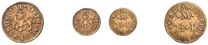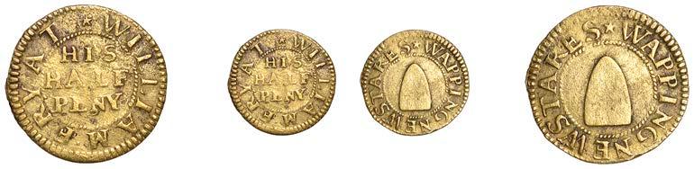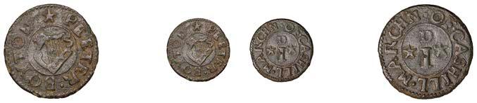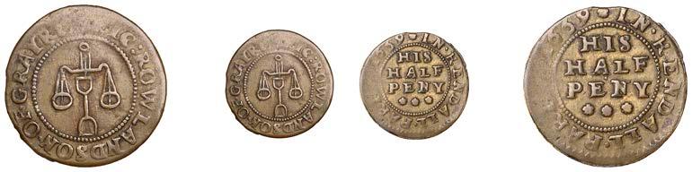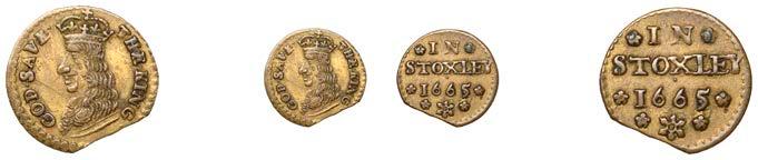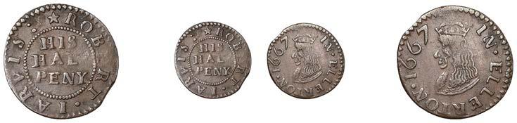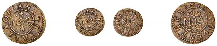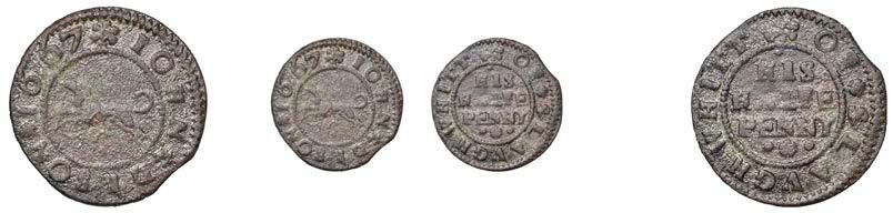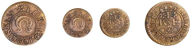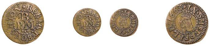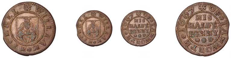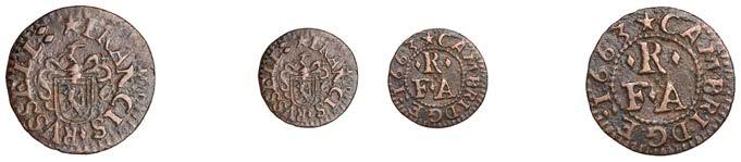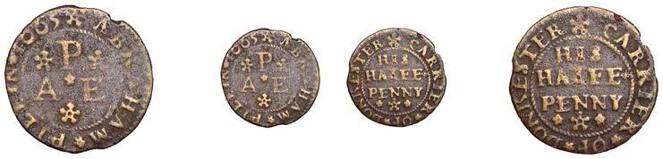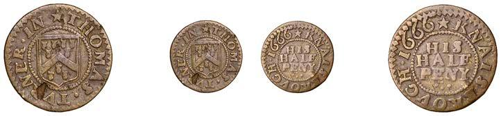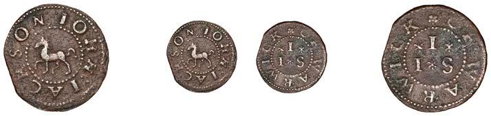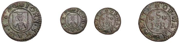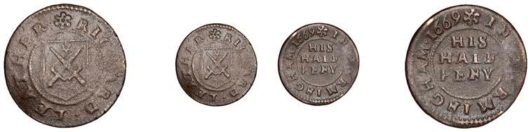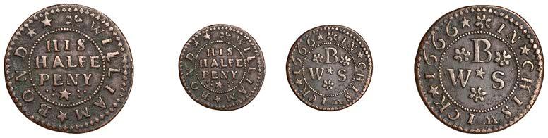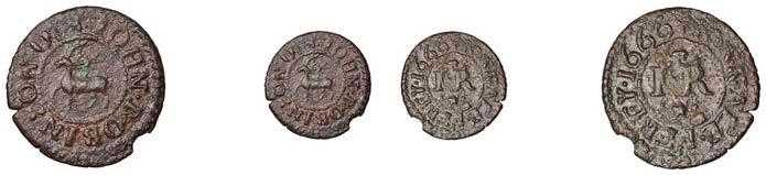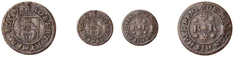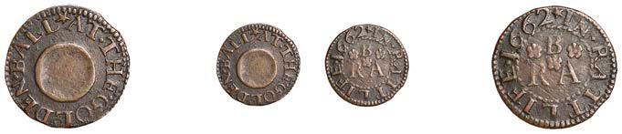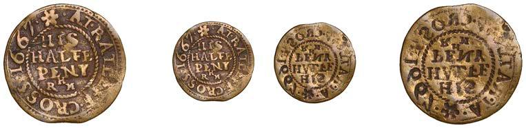 Alcester,Tho.Pickerd,Halfpenny,1664,1.74g/12h(N5270;BW.7);JohnReinoles,Halfpenny,1670,1.22g/12h(N5271, thispiece; BW.8);WilliamReynolds,Farthings(3),1652(2),0.88g/6h(N5272, thispiece;BW.9),0.99g/6h(N5273a, thispiece;BW.9),1662, 1.06g/3h (N 5274, this piece; BW. 10) [5]. N 5270 very !ne, N 5271 good !ne, others about !ne and better but N 5273 pierced £180-£220