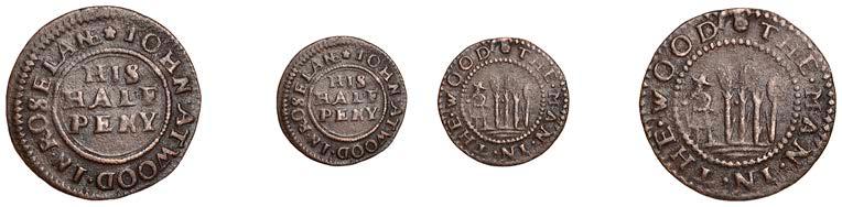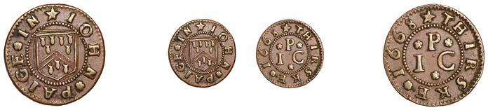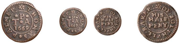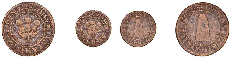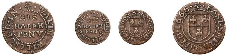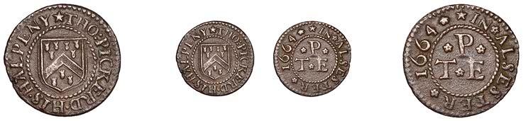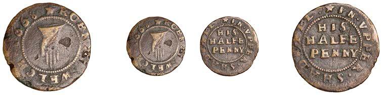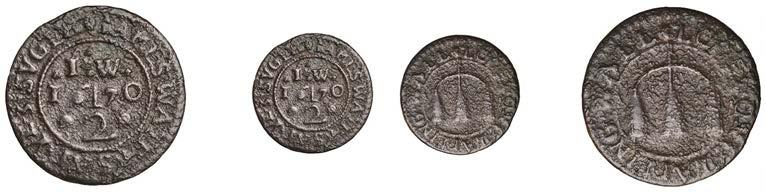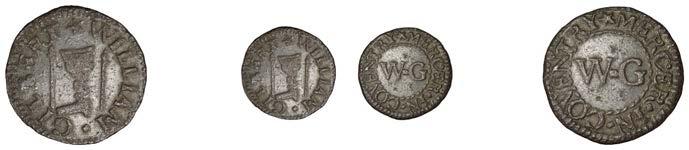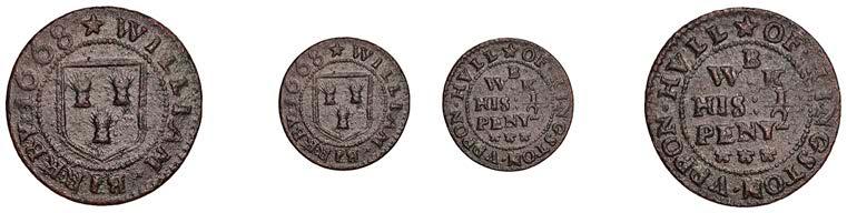 WILTSHIRE, Calne,StephenBaylie,Farthing,0.67g/6h(N5427;BW.24); Devizes,EdwardHope,Farthing,1652,0.33g/12h(N 5458;BW.68),GraceNaish,Farthing,1652,1.11g/6h(N5460;BW.71); Highworth,JohnTomes,Farthing,1652,1.13g/6h(N 5480;BW.95); Salisbury,GeorgeGodfery,Farthing,1659,1.36g/12h(N5554;BW.189),ThomasHaytor,Halfpenny,1666, 1.36g/12h(N5560;BW.196),JonathanHill,Halfpenny,1668,1.06g/6h(N5562;BW.197),J[ohn]P[acker],Farthing,1.22g/3h(N 5587;BW.210),GeorgePage,Farthing,1656,1.00g/6h(N5570;BW.211); Trowbridge,WilliamSmith,Farthing,0.91g/9h(N 5608;BW.252); Warminster,JamesEliott,Farthing,1.01g/6h(N5612;BW.257)[11]. Variedstate,N5562withlargecentral piercing £60-£80