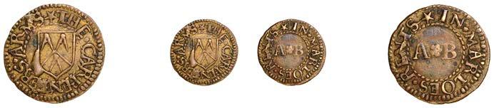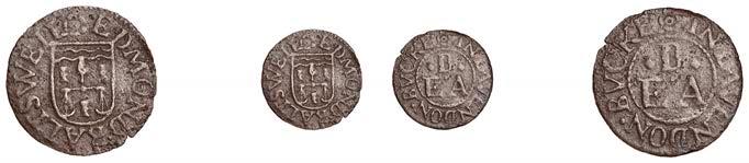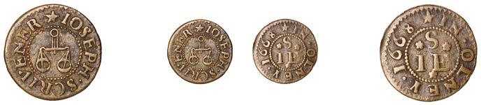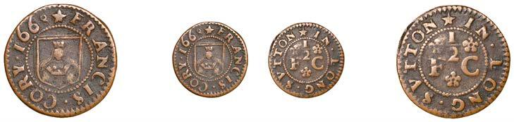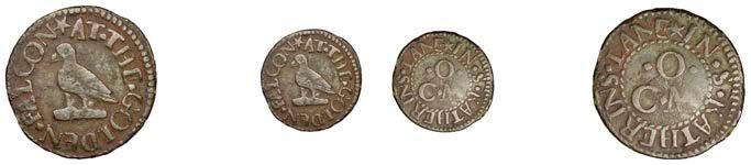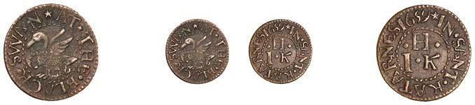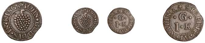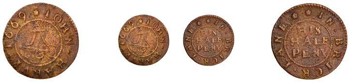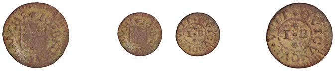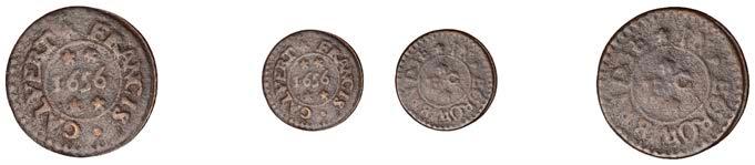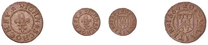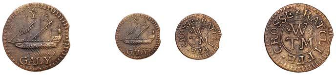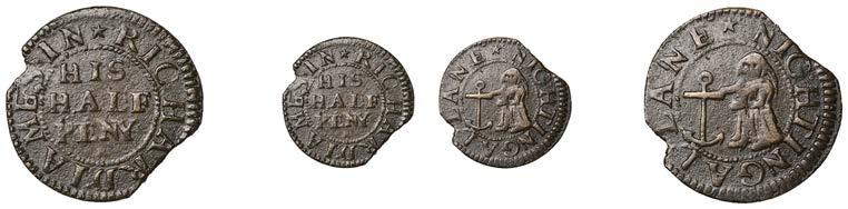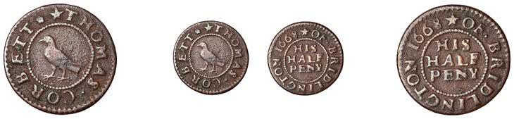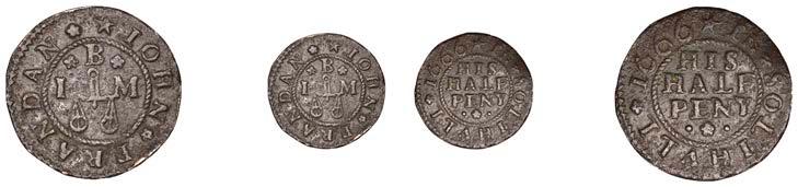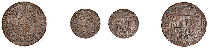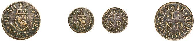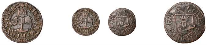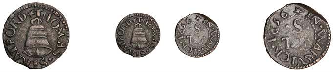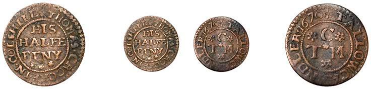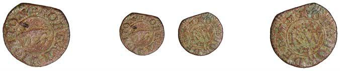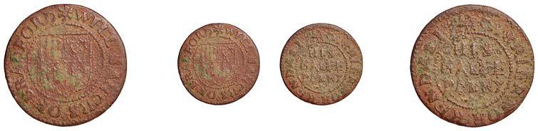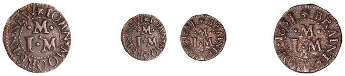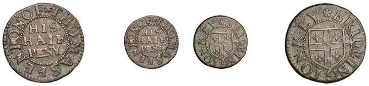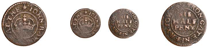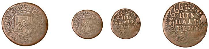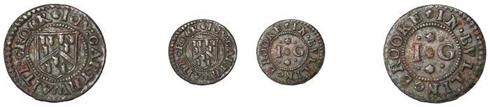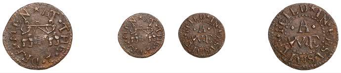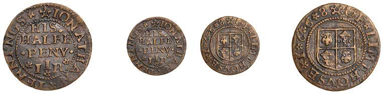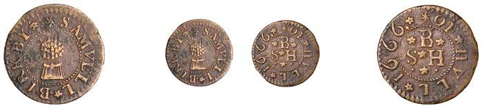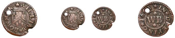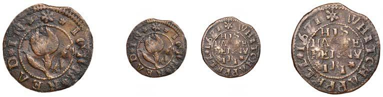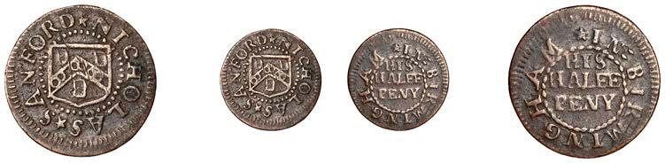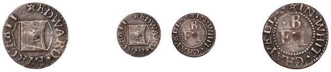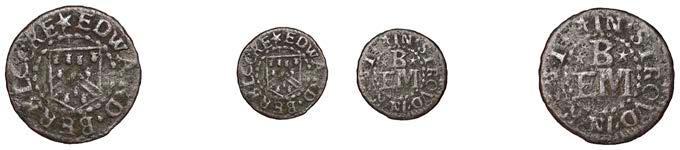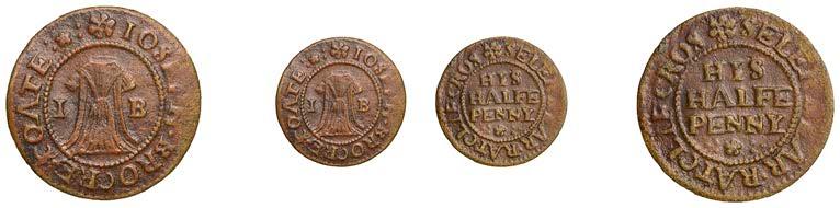 Birmingham,JohnBrington,Halfpenny,1.65g/3h(N–;BW.25);WilliamColmore,Halfpenny,0.99g/9h(N–;BW.28);Edward Ensor,Farthing,1652,0.96g/6h(N5284;BW.29),Halfpenny,1660,1.19g/3h(N5285b, thispiece;BW.31)[4]. Thirdabout !neand very rare, others poor but extremely rare