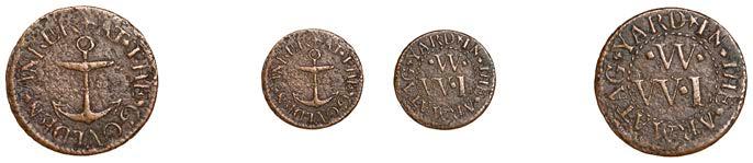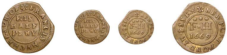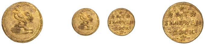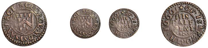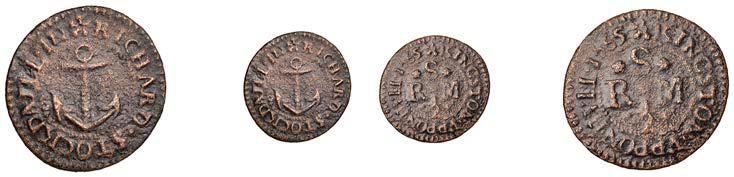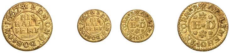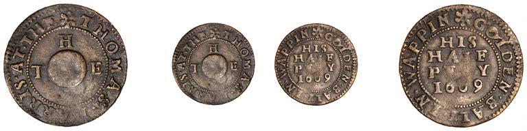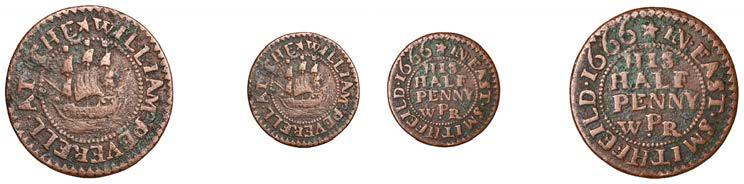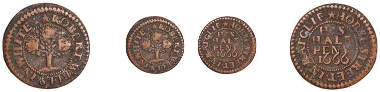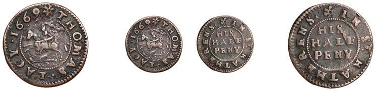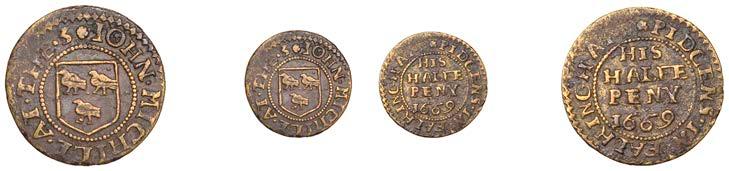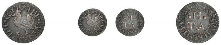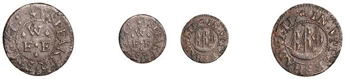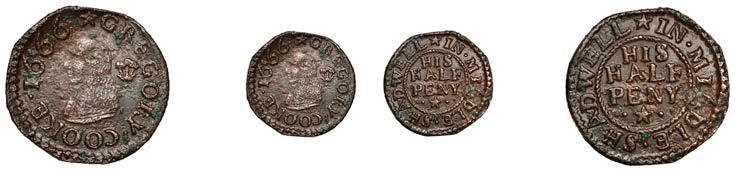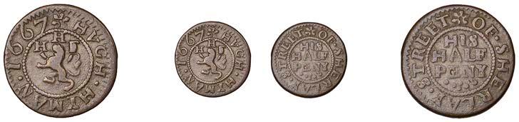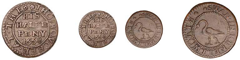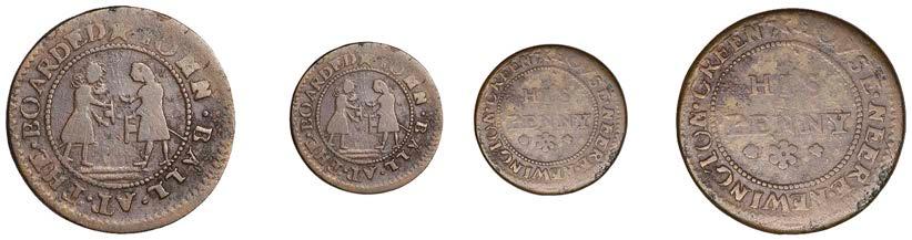 Duplicates: Ratcli Cross, W.E.B. AT THE SHIPP TAVERN, Farthing, 1.17g/6h (N 8367; BW. 2322); Will Baker, Halfpenny, 1.20g/3h (N 8366; BW. 2324); Alexander Harwood, Farthing, 0.97g/6h (N –; BW. 2328); John March, Farthings (2), 1.17g/6h, 1.00g/6h (both N 8368, latter 8368a, this piece; W. 2330); John Simons, Halfpenny, 1666, 2.54g/12h (N –; BW. 2332) [6]. About !ne and better, BW. 2328 with ‘river’ patina £100-£150