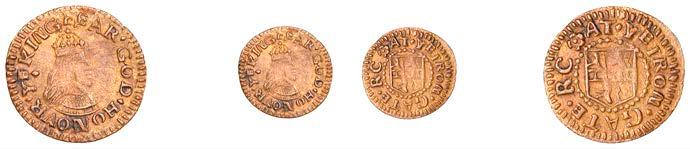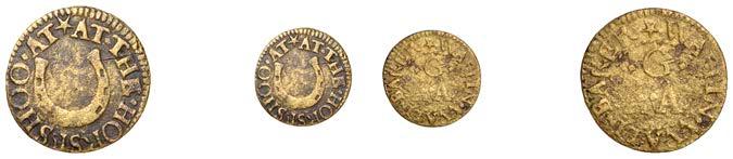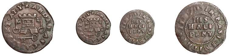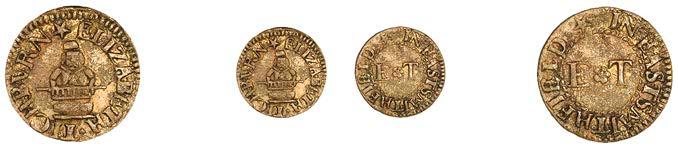 Birmingham,GeorgeFentham,Halfpenny,1.97g/3h(N5286, thispiece;BW.32);ThomasFewttrillandJohnCotterill,Halfpenny, 1666,0.67g/6h(N5287;BW.43);EdwardFreeman,Halfpenny,1.87g/6h(N–;BW.33)[3]. Firstmediocrebutextremelyrare,second small of #an, broken and repaired, last partially discoloured but !ne, both very rare £200-£260
