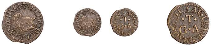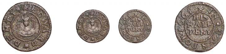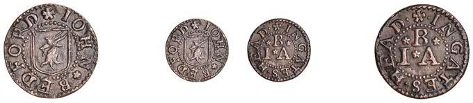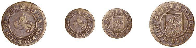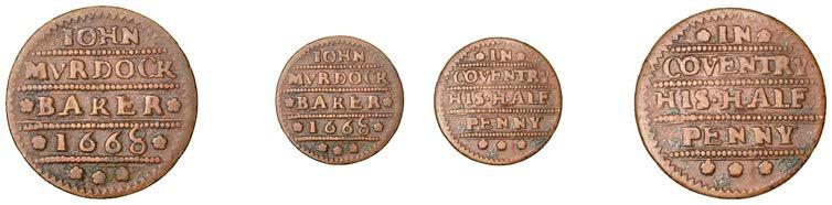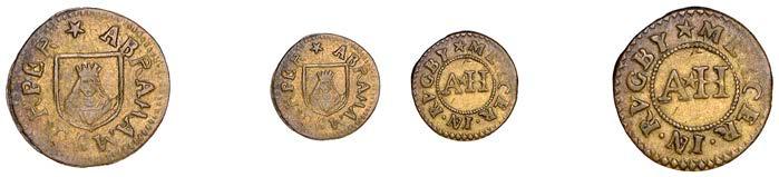 Alcester,MathiasCrabb,Farthing,1.20g/12h(N5267, thispiece;BW.2);JosephDewes,Farthing,1654,0.93g/6h(N5268;BW.3); FulkeEmes,Farthing,1657,1.20g/6h(N5269;BW.4);CharlesJohnson,Farthing,1.37g/6h(N9276;BW.5)[4]. Last !nebutscarce, others about very !ne £140-£180