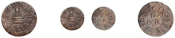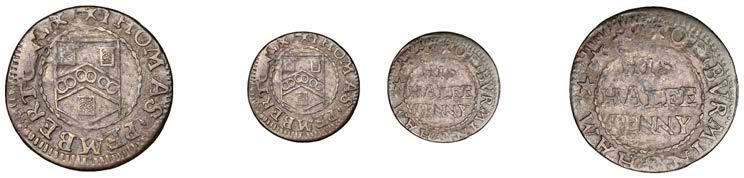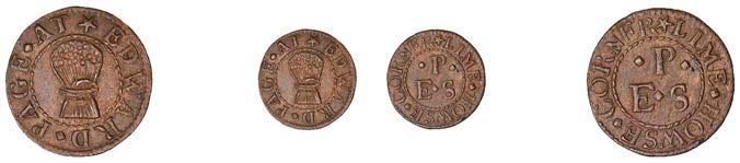 OXFORDSHIRE, Bampton,SimonBassett,Halfpenny,1669,1.94g/6h(N3564;BW.3); Banbury,T[homas]P[ym],Halfpenny, 1.53g/12h(N–;BW.13),HenrySmith,Farthing,1656,0.81g/6h(N3577;BW.20); Burford,E[dmond]C[astle],Farthing,1653, 1.14g/6h(N3607;BW.47),ThomasMathewes,Farthing,0.73g/6h(N3605;BW.48),JohnSindriy,Farthing,1653,1.11g/6h(N3602; BW.52); Chinnor,WiliamGold nch,Farthing,1662,0.60g/3h(N3609;BW.56); ChippingNorton,SamuelFarmer,Farthing, 0.56g/6h(N3614;BW.64),HenryFawler,Farthing,1.40g/6h(N3616;BW.66),EdmondRowlright,Farthing,0.83g/9h(N3620; BW.71),PhillippWisdome,Halfpenny,1670,1.29g/12h(N3622;BW.72); Deddington,SamuellBelcher,Halfpenny,1668, 1.44g/12h(N3627;BW.78); Henley-on-Thames,AmbrosFreeman,Farthing,1.08g/9h(N3648;BW.96); NorthLeigh, WilliamandAnnMason,Halfpenny,1.54g/12h(N3661;D110A); Oxford,HumphryBodicott,Farthing,1.12g/6h(N3683;BW. 124) [15]. Varied state, N 3564 and 3605 with incomplete #ans £70-£90