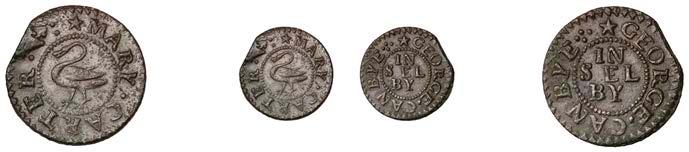 Duplicates: Ratcli , Francis Bull, Farthing, 1656, 0.75g/6h (N 8345; BW. 2341); Robert Rooke, Halfpenny, 1666, 2.51g/12h (N 8358; BW. 2361); Tho. Sorell, Halfpence (2), 2.32g/3h, 1.56g/6h (both N 8355, former this piece; BW. 2366); N.E.V. AT THE BLACK BOAY, Farthing, 0.97g/6h (N 8351; BW. 2371) [5]. Varied state, !rst struck on a bar end £80-£100