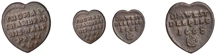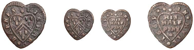 SUFFOLK, Debenham, Amos Fisher, heart-shaped Halfpenny, 1668, 1.13g/12h (N –; BW. 114). Centres worn, light surface corrosion and an edge crack, otherwise about !ne, very rare £80-£100