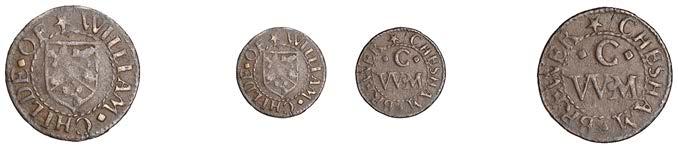 WILTSHIRE, Aldbourne,JohnAdee,Farthing,1656,0.36g/6h(N5405;BW.1); Devizes,EdwardHope,Farthing,1652, 0.72g/6h(N5458;BW.68),GraceNaish,Farthings,1652(3),1.04g/6h,0.66g/6h(bothN5460;BW.71),1.18g/6h(N5461;BW. 71); Kingswood,EdwardTanner,Farthing,1658,1.09g/3h(N5486;BW.98); Malmesbury,EdwardBrowne,Farthing,0.86g/10h (N5492;BW.107); Marlborough,BoroughFarthing,1668,1.17g/6h(N5505;BW.123-5),RichardShipre,Farthing,1.08g/6h(N 5522;BW.143); Salisbury,ThomasCutlerJr,Halfpenny,1666,2.37g/12h(N5546;BW.171),J[ohn]P[acker],Farthing,0.86g/6h (N5586;BW.210),GeorgePage,Farthing,1657,0.83g/12h(N5572;BW.212); Westbury,ThomasHancocke,Farthing,1656, 0.88g/6h (N 5616; BW. 261) [13]. Varied state, N 5522 pierced £60-£80